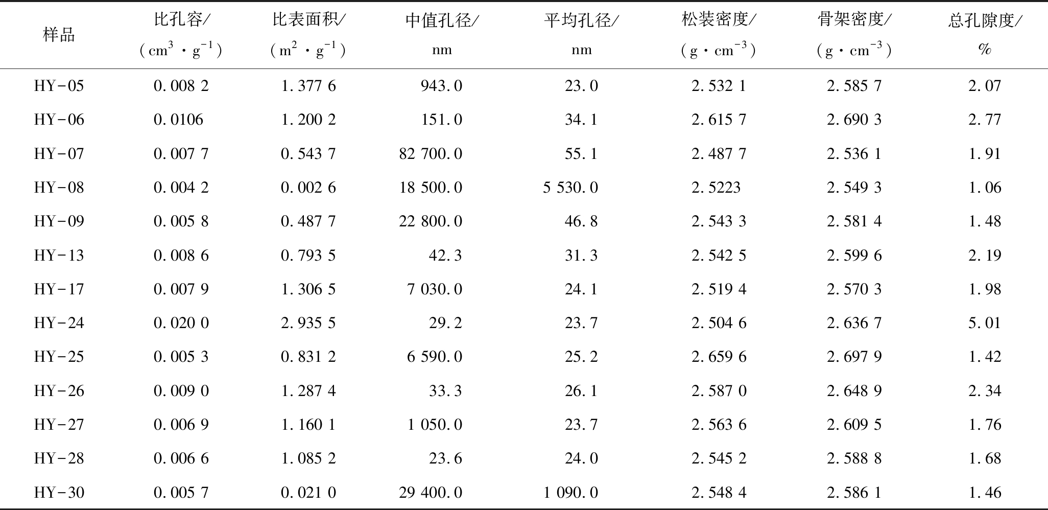 样品比孔容/(cm3·g-1)比表面积/(m2·g-1)中值孔径/nm平均孔径/nm松装密度/(g·cm-3)骨架密度/(g·cm-3)总孔隙度/%HY-050.008 21.377 6943.023.02.532 12.585 72.07HY-060.01061.200 2151.034.12.615 72.690 32.77HY-070.007 70.543 782 700.055.12.487 72.536 11.91HY-080.004 20.002 618 500.05 530.02.52232.549 31.06HY-090.005 80.487 722 800.046.82.543 32.581 41.48HY-130.008 60.793 542.331.32.542 52.599 62.19HY-170.007 91.306 57 030.024.12.519 42.570 31.98HY-240.020 02.935 529.223.72.504 62.636 75.01HY-250.005 30.831 26 590.025.22.659 62.697 91.42HY-260.009 01.287 433.326.12.587 02.648 92.34HY-270.006 91.160 11 050.023.72.563 62.609 51.76HY-280.006 61.085 223.624.02.545 22.588 81.68HY-300.005 70.021 029 400.01 090.02.548 42.586 11.46