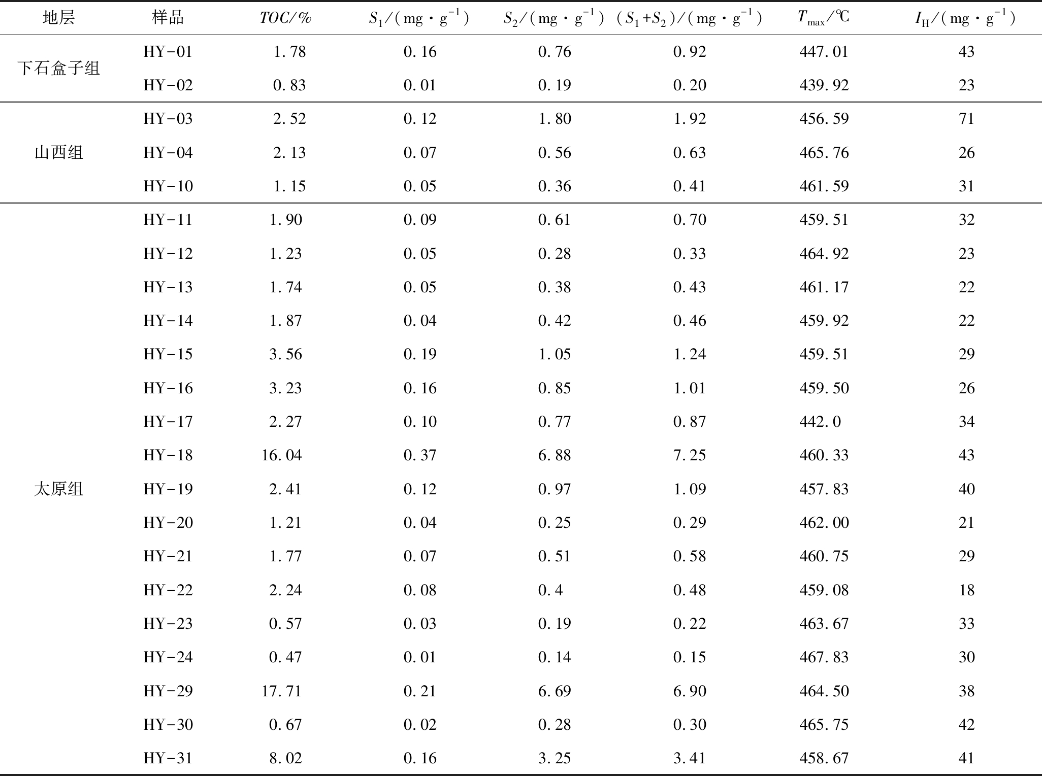 地层样品TOC/%S1/(mg·g-1)S2/(mg·g-1)(S1+S2)/(mg·g-1)Tmax/℃IH/(mg·g-1)下石盒子组HY-011.780.160.760.92447.0143HY-020.830.010.190.20439.9223山西组HY-032.520.121.801.92456.5971HY-042.130.070.560.63465.7626HY-101.150.050.360.41461.5931太原组HY-111.900.090.610.70459.5132HY-121.230.050.280.33464.9223HY-131.740.050.380.43461.1722HY-141.870.040.420.46459.9222HY-153.560.191.051.24459.5129HY-163.230.160.851.01459.5026HY-172.270.100.770.87442.034HY-1816.040.376.887.25460.3343HY-192.410.120.971.09457.8340HY-201.210.040.250.29462.0021HY-211.770.070.510.58460.7529HY-222.240.080.40.48459.0818HY-230.570.030.190.22463.6733HY-240.470.010.140.15467.8330HY-2917.710.216.696.90464.5038HY-300.670.020.280.30465.7542HY-318.020.163.253.41458.6741
