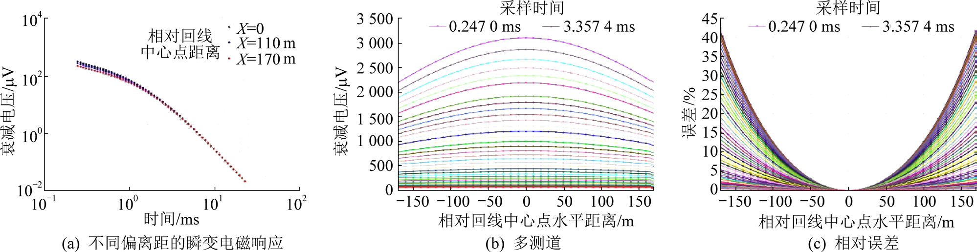 距中心点的偏离距增大后,瞬变电磁的衰减曲线与中心点相比,差异主要集中在早期(图3a)。多测道曲线在偏离距较大的地方处有明显降低趋势(图3b),且偏离距越大,衰减曲线相对于中心点衰减曲线的相对误差也越大,距离边框仅10 m时,相对误差最大可达42%(图3c)。