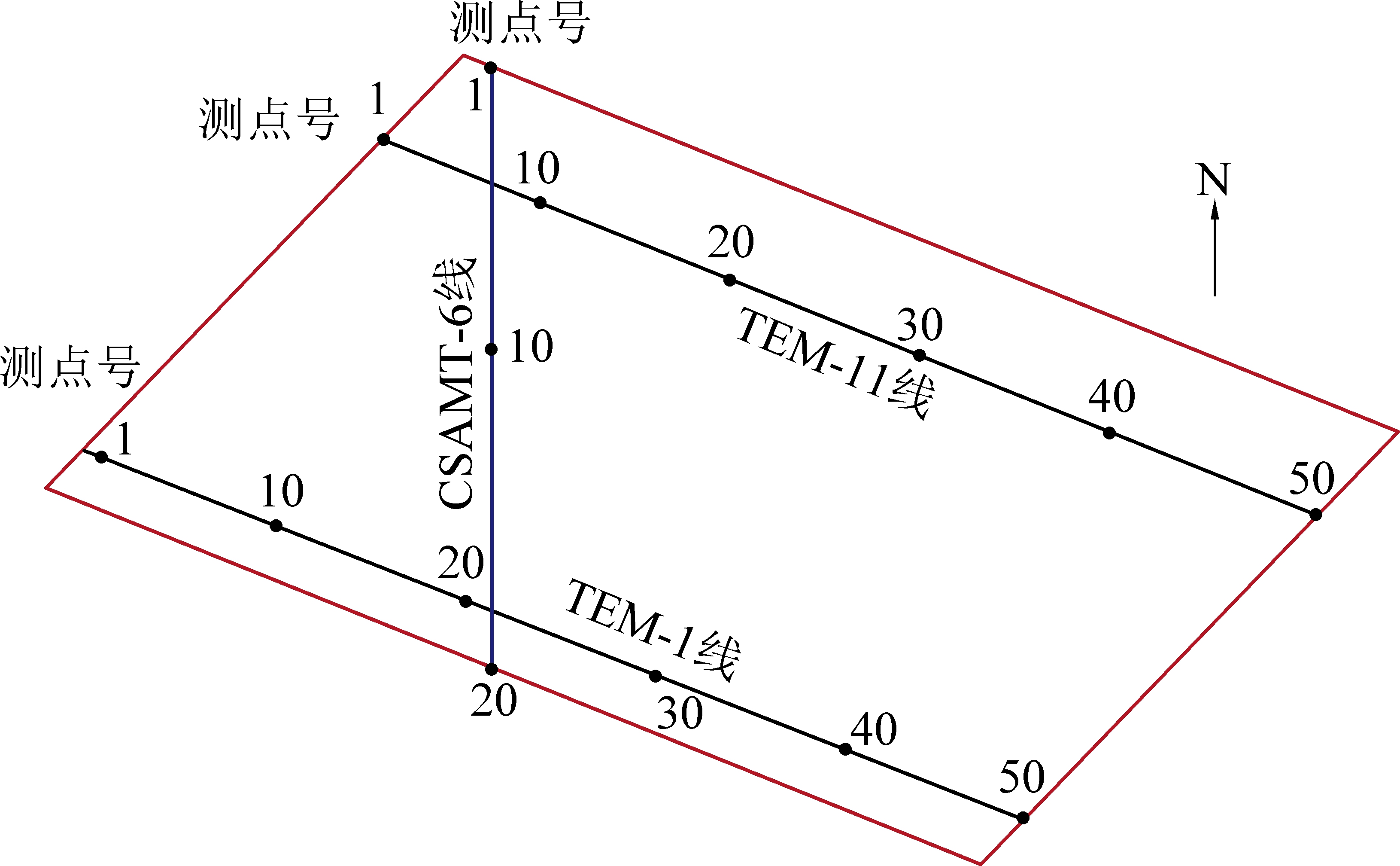 以测区CSAMT-6线以及TEM-1线、11线为例,利用带大定源TEM一维反演联合优化频点后的CSAMT进行采空区探测。TEM探测参数:外框尺寸360 m×360 m,内框接收面积为总面积的4/9,发射频率25 Hz;CSAMT探测参数:发射源AB长2.4 km,收发距13 km,发射频率包括22个频点:3 840、2 844、853.3、307.2、1 920、1 422、1 067、948.1、853.3、768、711.1、640、568.9、426.7、307.2、284.4、213.3、153.6、142.2、106.7、76.8、71.11、53.33、38.4 Hz。