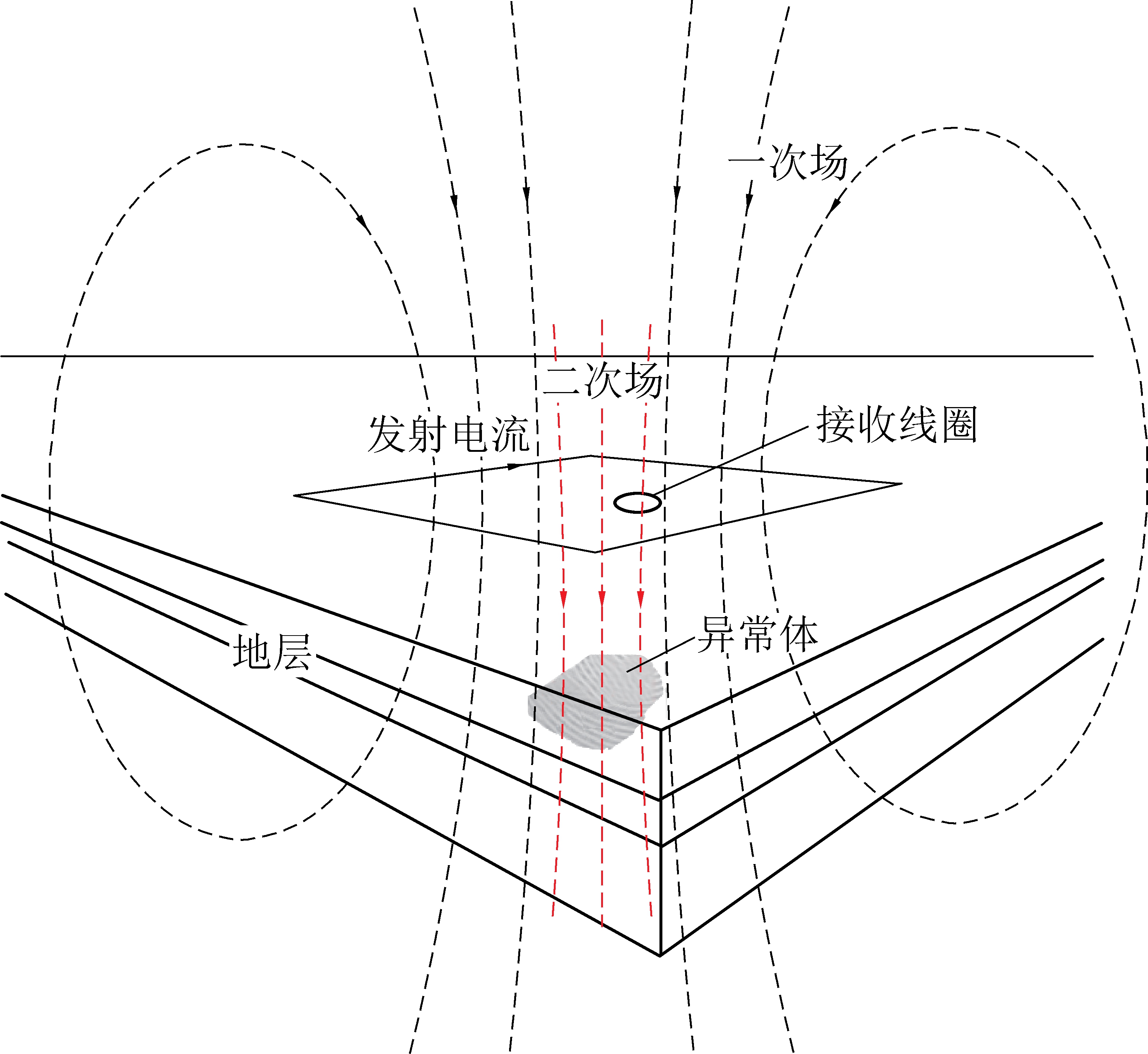 瞬变电磁法(TEM)属电磁感应类探测方法,利用电偶源或磁偶源,建立地下的一次脉冲磁场,通过接收线圈在地面测量地下地质体感应产生的二次场,分析二次场的强弱及空间分布等特性,从而获得与地质体有关的信息,实现探测地下地质体的目的[16-17],其工作原理如图1所示。