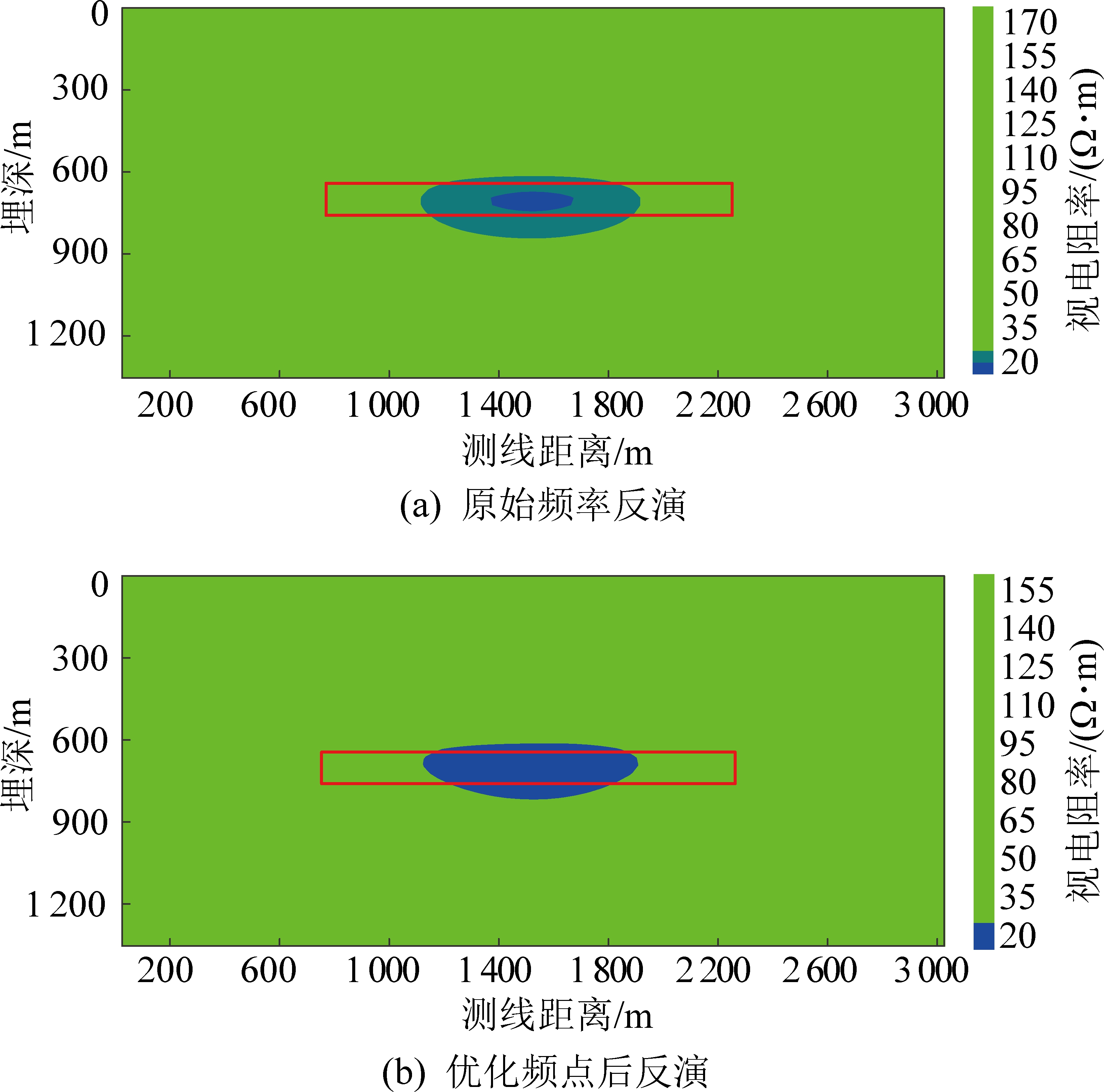 对正演数据进行二维OCCAM反演计算,不同发射频率的反演结果低阻板状体中心位置、埋深均与模型基本吻合,原始频率反演的低阻板状体向中心收缩(图7a),优化频点后反演的电阻率更接近模型的电阻率(图7b)。