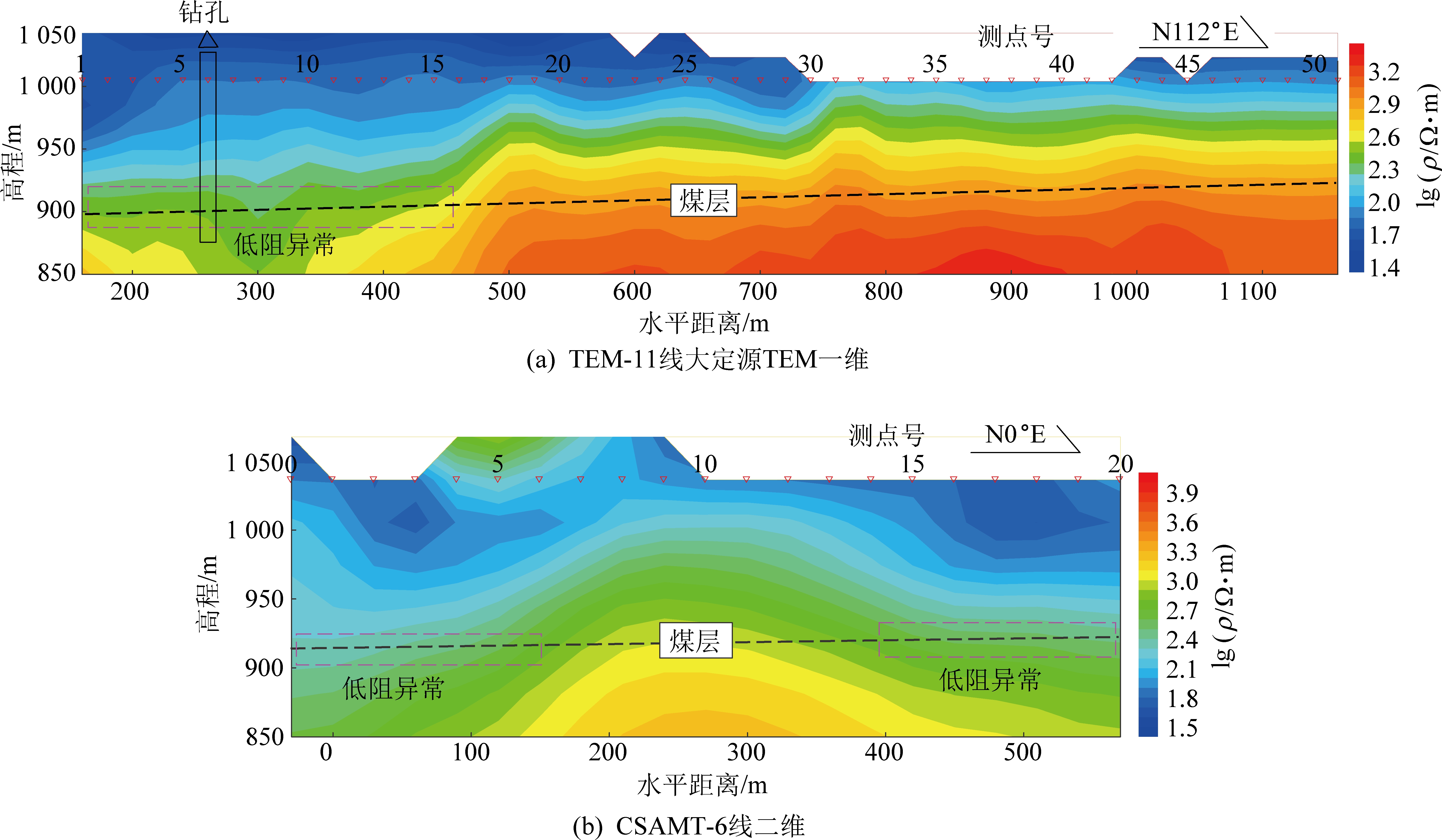 TEM-1线8号测点和40号测点衰减电压V曲线相比(图9a),8号测点衰减明显要慢,前者所反映的介质电性为相对低阻,后者为相对高阻。CSAMT-6线2号测点和11号点电阻率曲线相比(图9b),2号测点电阻率在1 067.0~568.9 Hz频率范围内为相对低阻,以含煤地层平均视电阻率90 Ω·m代入式(3)可得,1 067.0~568.9 Hz对应的探测深度为103~143 m,与煤层埋深相对应。