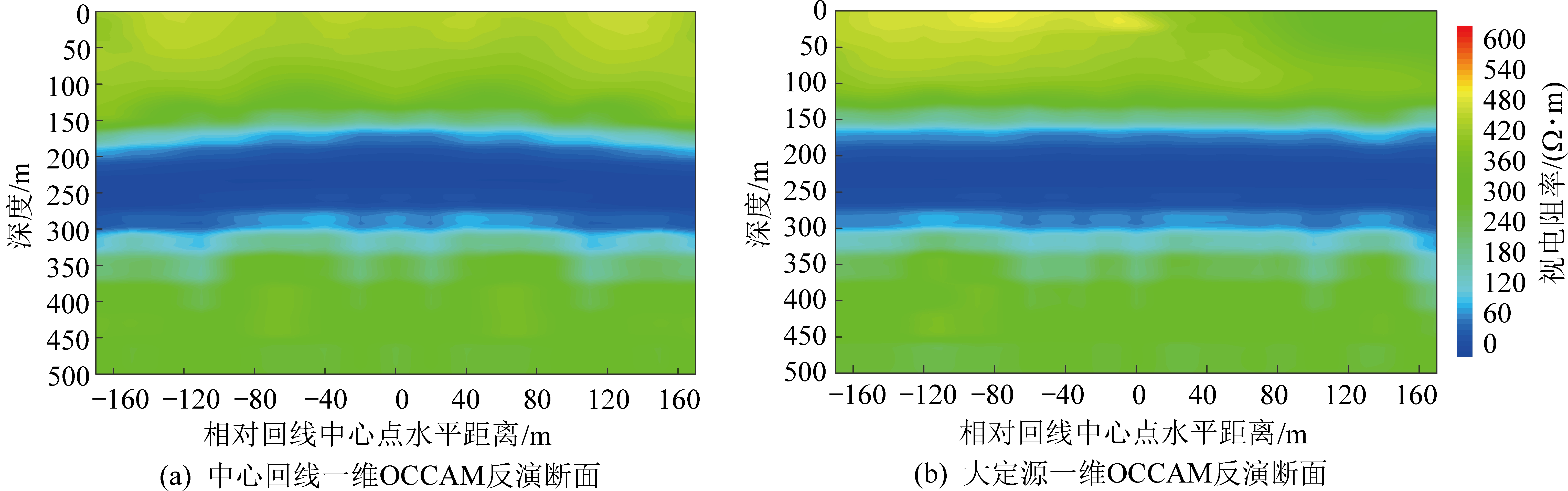 利用大定源TEM一维正演程序计算3层H型模型,其中3层H型模型各层的视电阻率ρ分别为300、10、300 Ω·m,各层厚度h分别为200、50、200 m。分别利用中心回线和大定源一维反演对正演数据进行反演计算,其中中心回线一维OCCAM反演计算结果如图4a所示,低阻层位产生明显畸变,越靠近框边畸变越严重,反演结果与实际模型不符。大定源一维OCCAM反演计算的结果显示如图4b,反演电阻率断面与实际地电模型相吻合,准确的反映出中间低阻层厚度与埋深,还原了真实的层状模型电阻率响应,消除了偏离距带来的早期信号偏差。