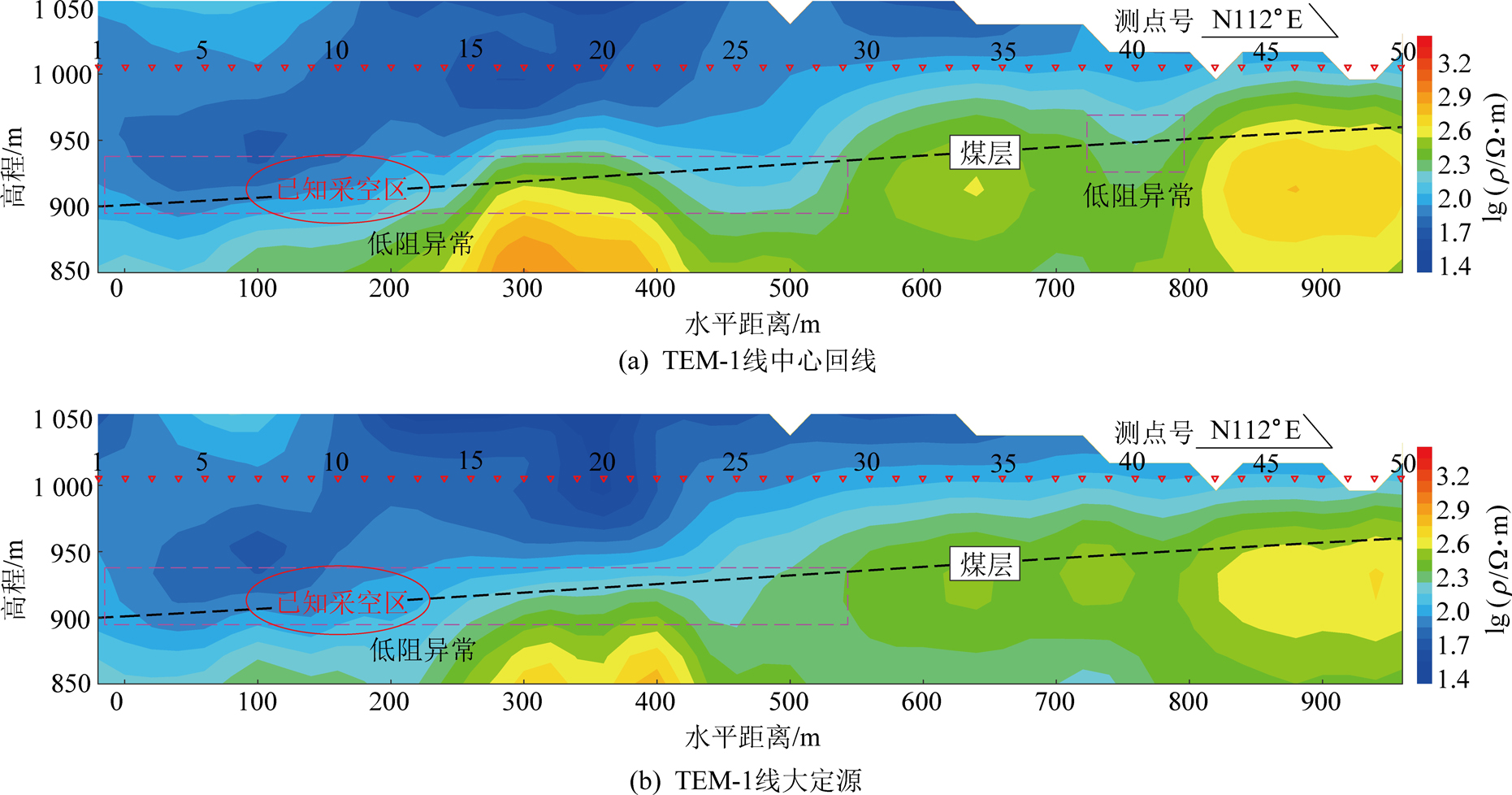 对TEM-1线分别利用中心回线和大定源一维反演计算,计算结果如图10所示,成图的电阻率已取对数lg ρ,图10a为中心回线一维反演结果,图10b为大定源一维反演结果,2种反演结果基本一致,反演电阻率总体上呈“低阻—高阻”的变化趋势,与实际地层的电性特征吻合。断面上表现为左侧低,右侧高,与煤层倾斜一致。煤层以粗虚线表示。7—13号点为已知采空区,断面上表现为低阻,所以推断图中低阻异常应为煤层采空且积水的电性反映。中心回线一维反演电阻率断面图显示38—42号测点间,煤层附近存在低阻异常,根据已知地质资料,该处煤层变薄,34号测点北侧20 m附近钻孔揭露煤层厚度约为0.3 m,孔中窥视结果显示孔内无水,采空积水的可能性很小。39、40号测点分别为内框中最靠近外框边线的测点,由正演模拟的结论可知,偏离中心点距离越大,中心回线一维反演处理计算的结果偏差越大,该异常可能由中心回线反演计算误差所致。因此对测区其余TEM数据均采用大定源一维反演。