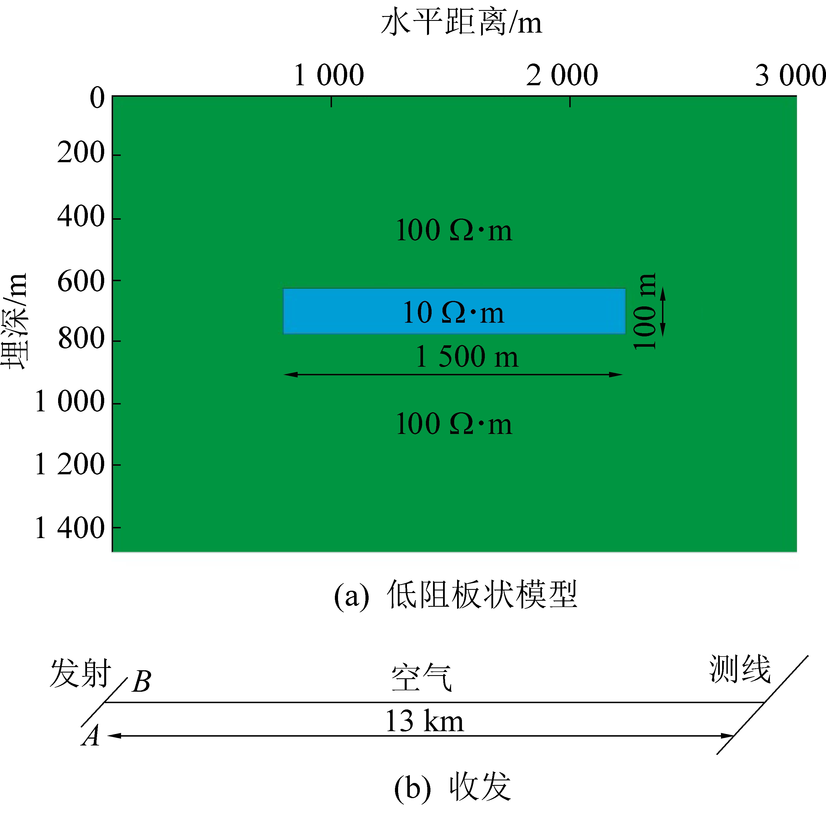 建立低阻水平板状模型(图5a),测线自0点至60点,点距50 m,测线长3 000 m,背景电阻率为100 Ω·m,低阻水平板电阻率为10 Ω·m,水平板位于测线750~2 250 m ,厚度100 m,中心埋深700 m。发射源AB长1.5 km,收发距为13 km(图5b)。