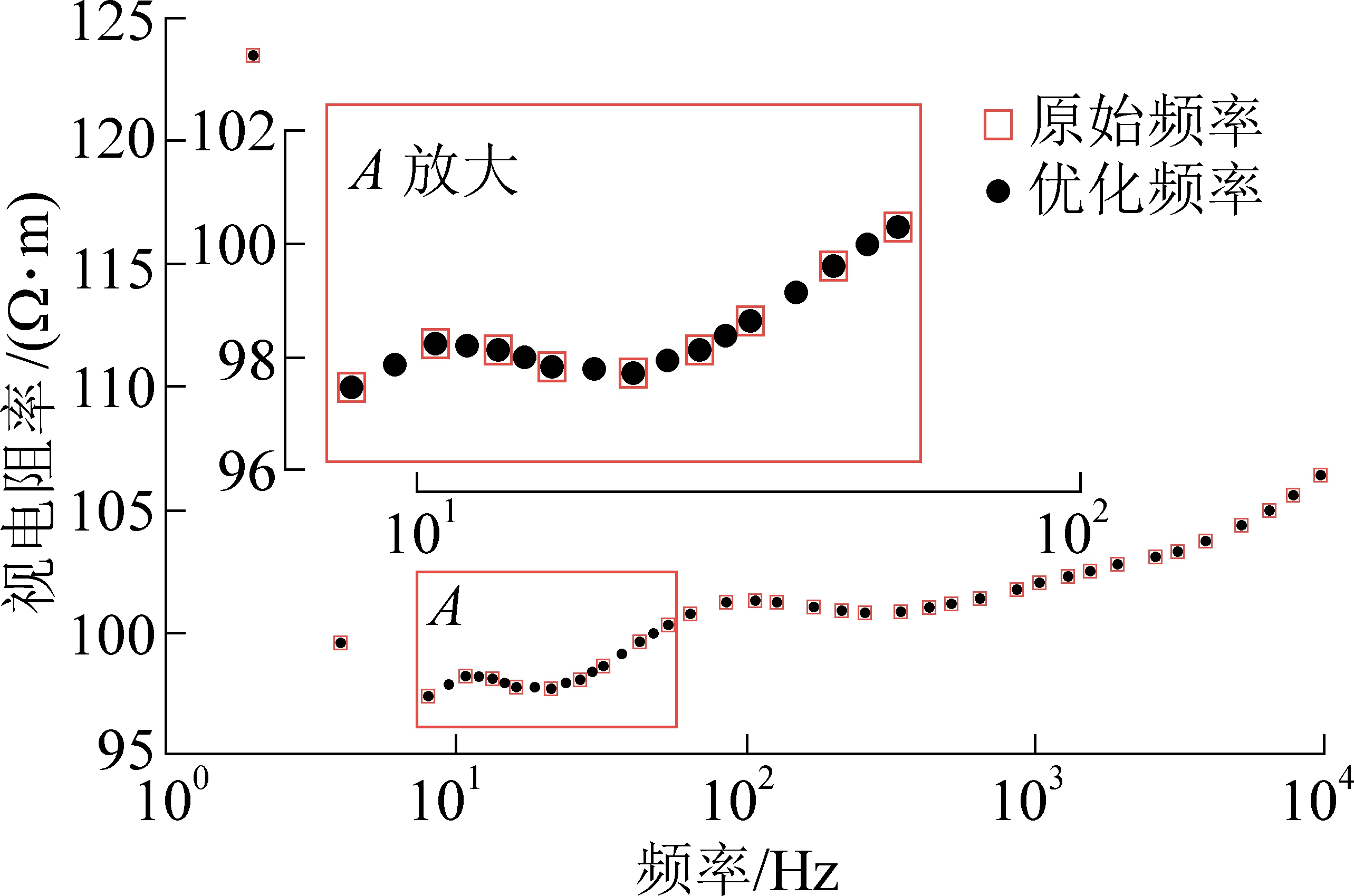 根据式(2),背景电阻率为100 Ω·m,目标体埋深700 m对应的发射频率约25 Hz,对CSAMT发射频率进行优化,加密8.0 ~53.3 Hz范围内的频率。优化前的发射频率为9 600、7 680、6 400、5 120、3 840、3 072、2 560、1 920、1 536、1 280、1 024、853.3、640、512、426.7、341.3、256、213.3、170.7、128、106.7、85.3、64、53.3、42.7、32、26.7、21.3、16、13.3、10.7、8、4、2 Hz,共计34个频点;优化后的发射频率为9 600、7 680、6 400、5 120、3 840、3 072、2 560、1 920、1 536、1 280、1 024、853.3、640、512、426.7、341.3、256、213.3、170.7、128、106.7、85.3、64、53.3、48、42.7、37.35、32、29.53、26.7、24、21.3、18.65、16、14.65、13.3、12、10.7、9.35、8、4、2 Hz,共计42个频点。不同发射频率正演计算,得到的单点电阻率曲线如图6所示。