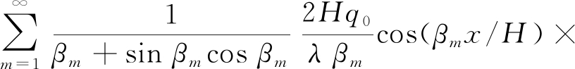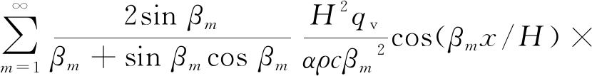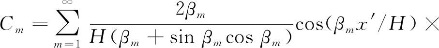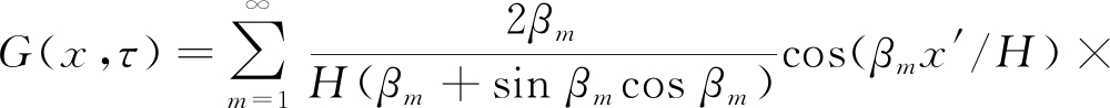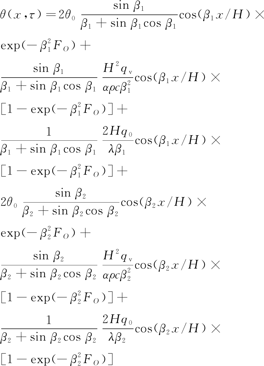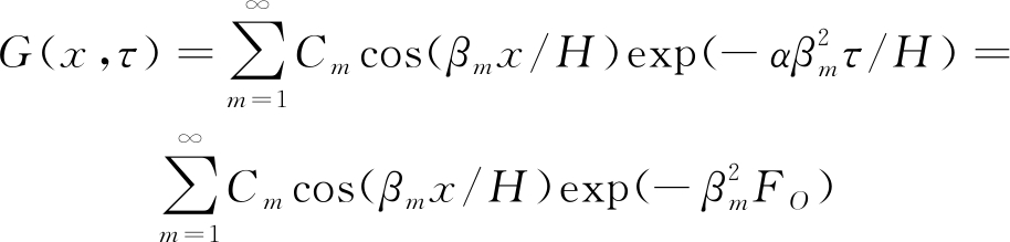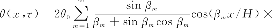 其中:FO=ατ/H2为傅里叶数;βm(m=1,2,3,…)为超越方程cot(βm)=βm/Bi的正根,Bi为毕渥数,Bi=hH/λ。
