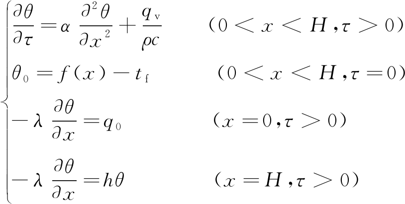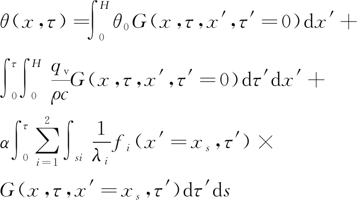 其中:si为边界面;xs为边界在x方向的值。式(10)等号右边第1项为充填体初始过余温度θ0对温度场θ(x,τ)的影响;第2项为充填体水泥水化热qv对温度场θ(x,τ)的影响;第3项表示边界条件对温度场θ(x,τ)的影响,其中,i=1时表示边界条件x=0,此时fi=q0;i=2时表示边界条件x=H,此时fi=hθ。