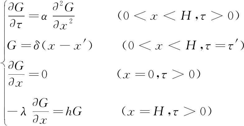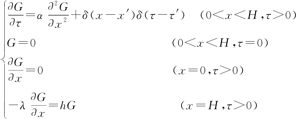其中:b为任意有限值,在τ′时刻作用在空间中任意一点x′的瞬时点热源相应的充填体导热方程的格林函数G满足以下辅助问题: