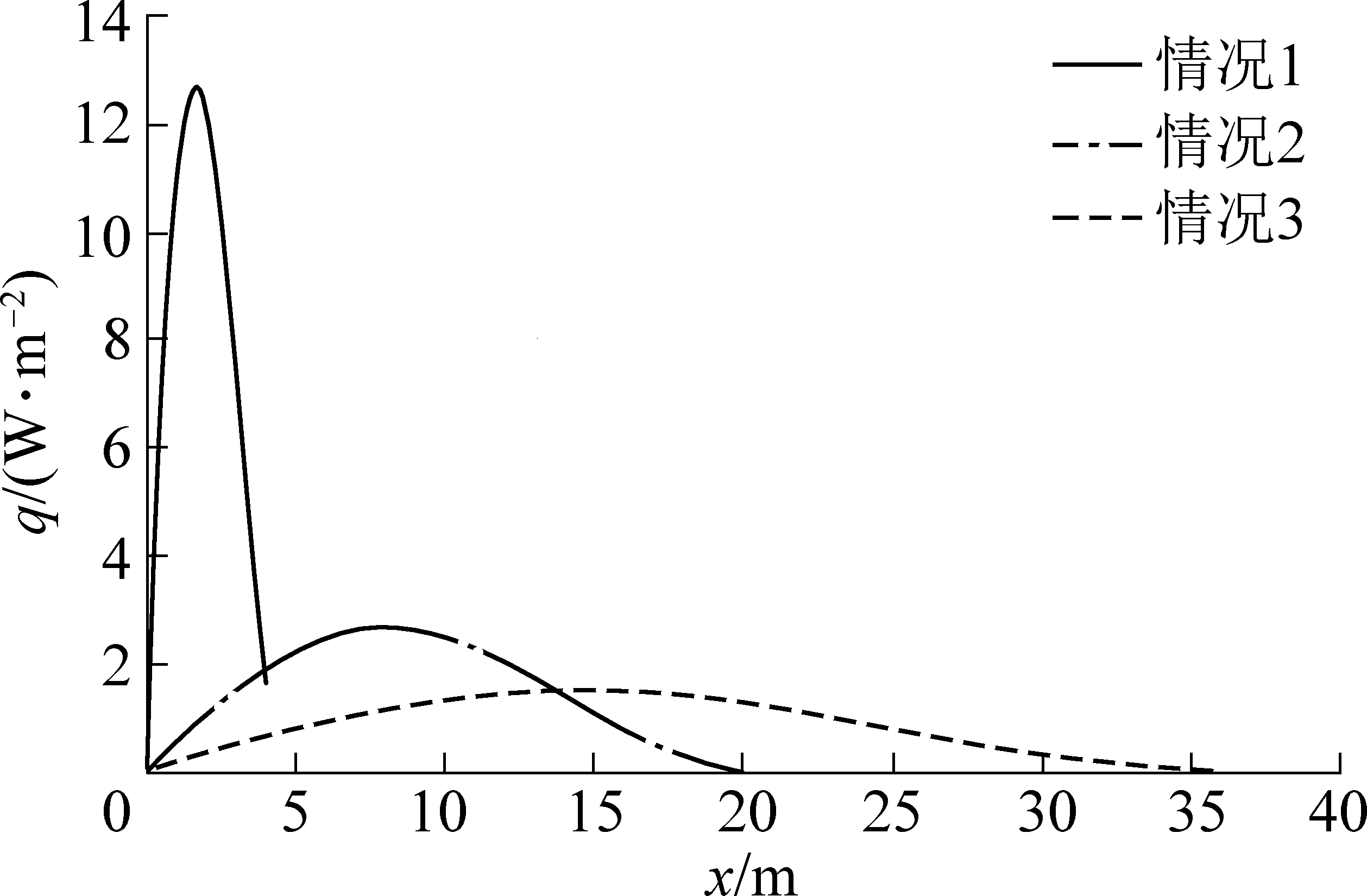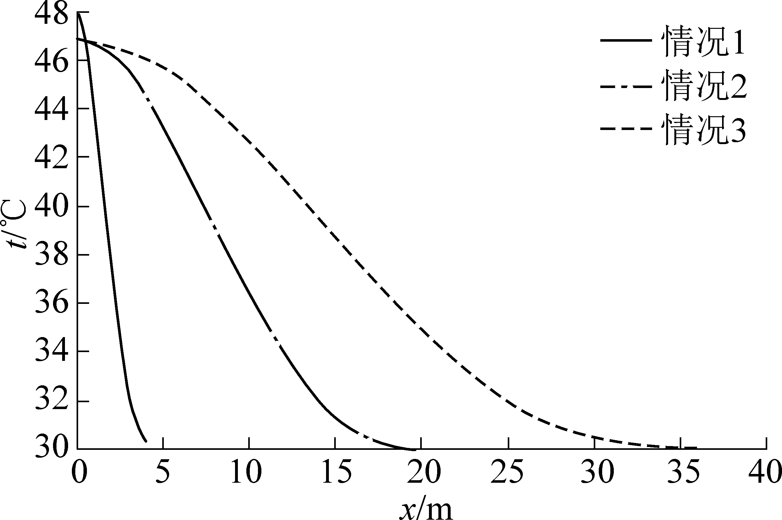从图2可以看出,随着充填体在x方向位移的增加,温度逐渐降低,在充填体底部(x=0 m)温度最高,达到峰值(情况1:47.91 ℃;情况2:46.86 ℃;情况3:46.83 ℃),在充填体顶部(x=20 m)温度最低,达到最低值(情况1:30.32 ℃;情况2:30.01 ℃;情况3:30.01 ℃)。充填体底部温度较高的原因在于来自岩石的传热以及水泥水化热的共同作用。充填体顶部温度接近工作面风流温度的原因在于,当毕渥数较大时,充填体表面对流换热热阻相对于充填体的导热热阻可以忽略,因此,传热一开始,充填体顶部的表面温度就立即接近工作面风流温度。