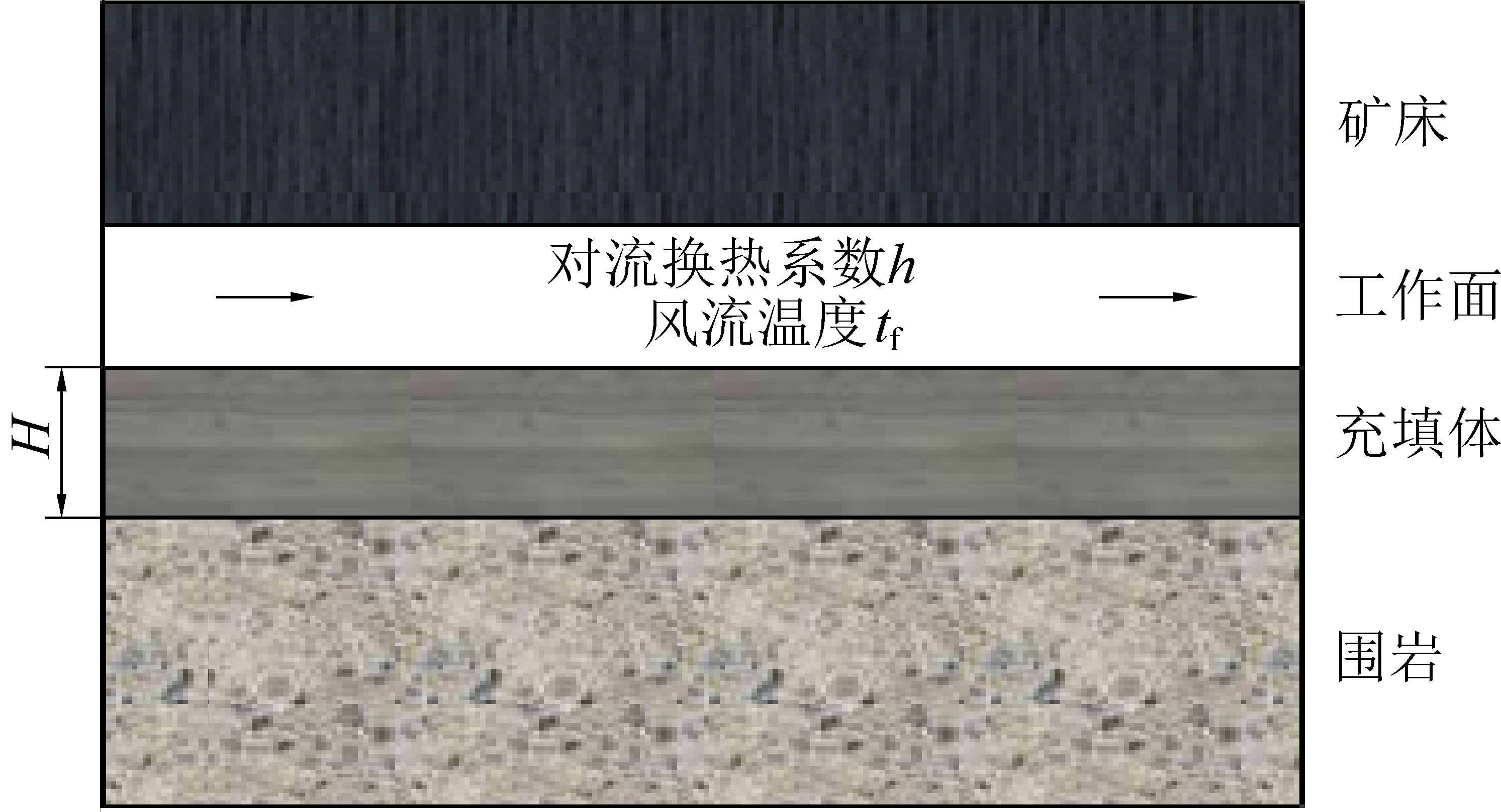 忽略充填体渗流,充填体内部以热传导的方式向风流传递热量,因此充填体内温度分布服从导热微分方程。基于上述假设,可将充填体传热问题简化为有内热源的一维非稳态导热微分方程,内热源为充填体中水泥的水化热,深井充填体传热物理模型如图1所示。