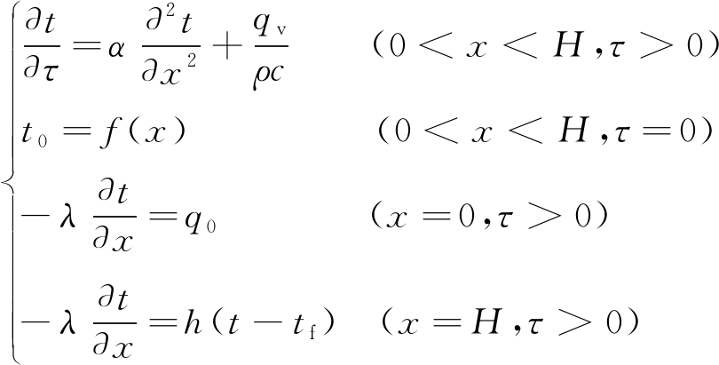 式中:t为充填体温度,℃;τ为传热时间,s;α为充填体热扩散系数,m2/s;x为充填体距充填体底部的距离,m; qv为单位面积充填体中水泥的水化热,W/m2;ρ为充填体的密度,kg/m3;c为充填体的比热容,kJ/(kg•℃);H为充填体的高度,m;t0为原始岩温,℃;λ为充填体的导热系数,W/(m•℃);q0为充填体下部岩石向充填体传入的热流密度,W/m2;h为风流与充填体的对流换热系数,W/(m2·℃)。