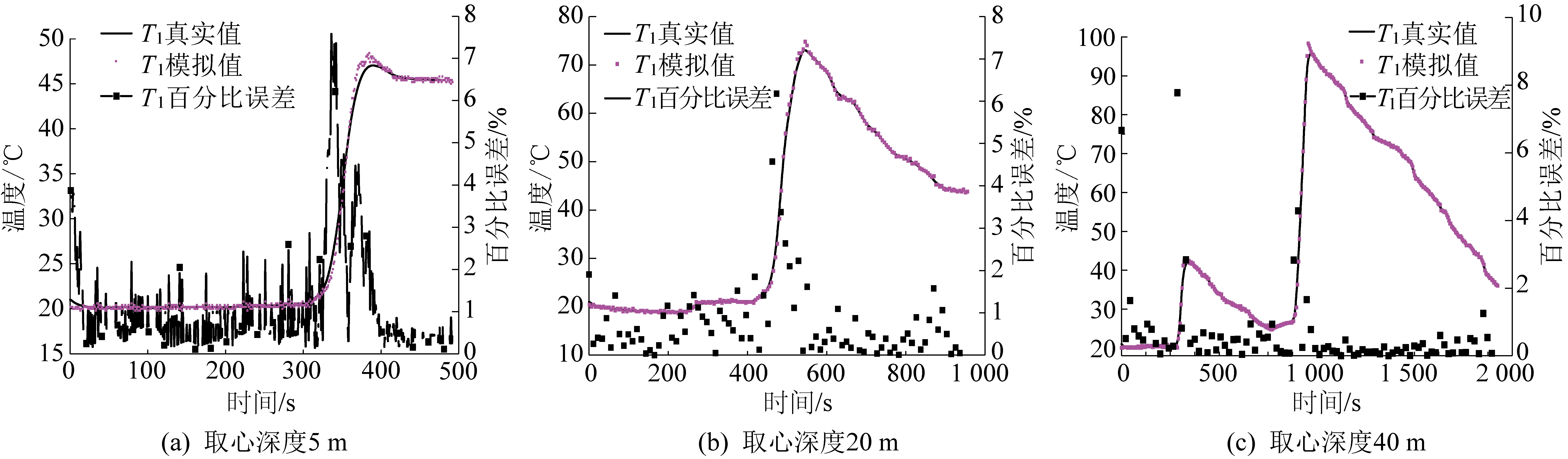 图8 不同取心深度下温度观测点温度模拟值与实测值百分比误差