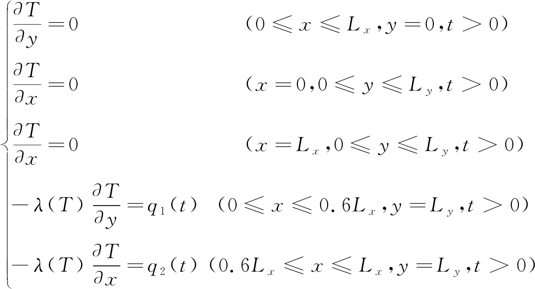 式中:ρ为取心管材料密度,kg/m3;c(T)为随温度变化的比热容,J/(kg·℃);∂T/∂t为温度随着时间的变化率;λ(T)为随温度变化的热导率,W/(m·K);∂T/∂x为温度在x方向上的变化率;∂T/∂y为温度在y方向上的变化率;x为长度方向上某点至原点的距离,cm;y为厚度方向上某点距原点的距离,cm;t为时间,s;Lx和Ly分别为取心管的长度和厚度,cm;q1(t)和q2(t)分别为取心管外壁前34 cm和后23 cm的热流密度,J/(m2·s);T0(x,y)为取心管的初始温度分布,℃。