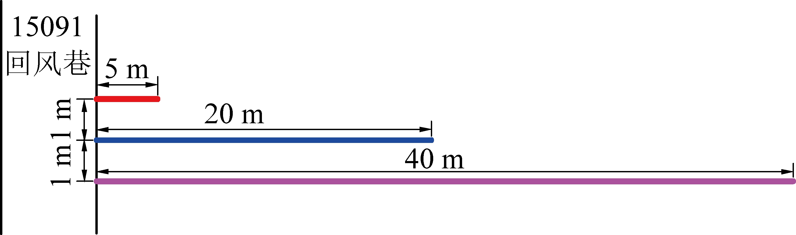 试验点选在焦煤集团九里山煤矿15091回风巷道。考虑到钻孔测温深度宜超出巷道调热圈深度及测温装置的续航时间等两方面,分别设计了取心深度为5、20、40 m的测温钻孔,在15091回风巷进行顺层钻孔施工,钻孔间距为1 m,如图3所示。