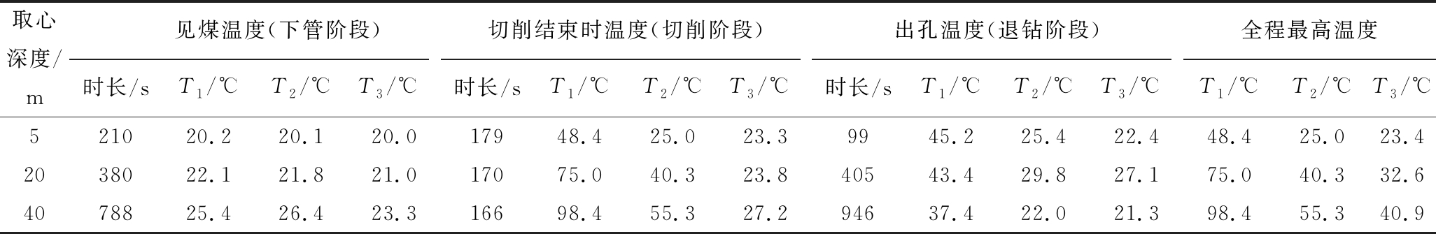 1)开展了钻孔取心过程中取心管管壁温度测试试验,试验发现,在下管阶段,当取心深度较大(40 m)时,存在取心管温度快速升高的现象;在切削阶段,不同取心深度下,取心管温度均呈现出切削进行一段时间后开始迅速升高,切削结束时升至最高值的规律;在退钻阶段,取心管温降速度基本相同,处于一个缓慢降低的状态。