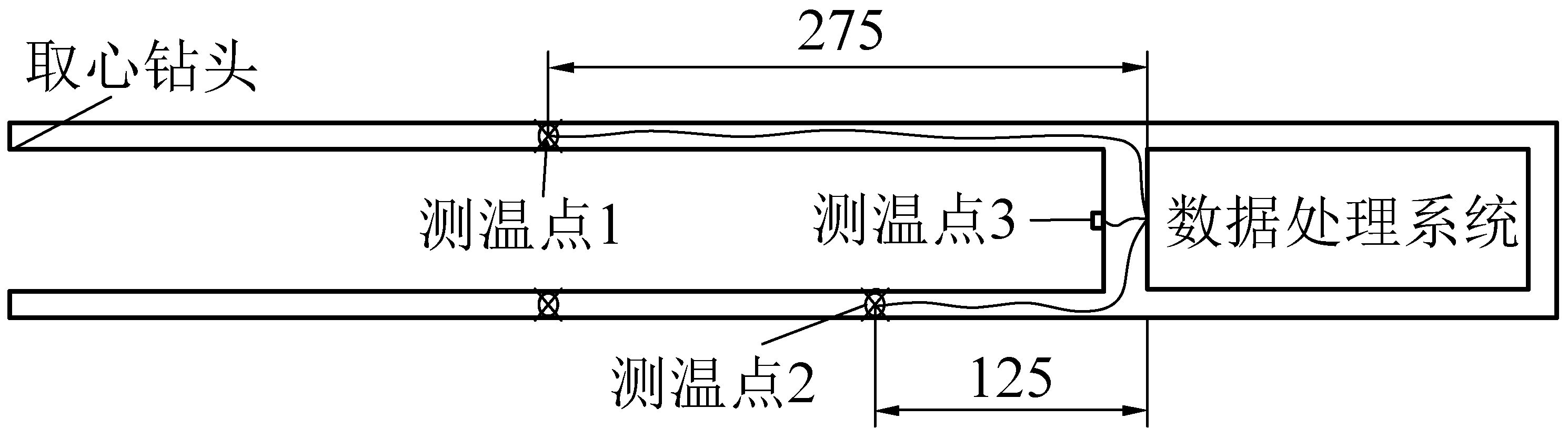 2)定制取心管管壁略微加厚,使用电脉冲沿取心管轴向方向打了2个深孔(长度分别为275、125 mm,直径为1 mm),可以分别插入同孔深的k型热电偶传感器T1和T2(测温范围0~600 ℃),用以测量取心过程中取心管管壁不同位置处的温度。