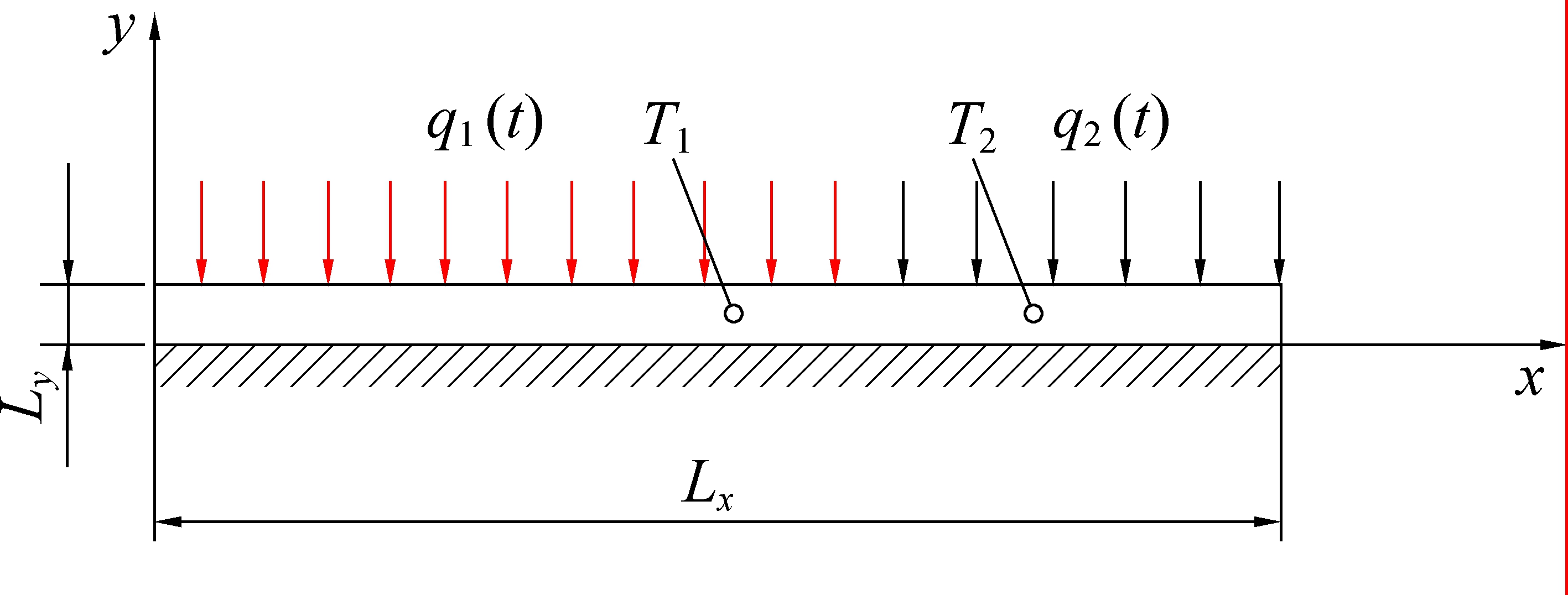 顺序函数法求解传热反问题是利用取心管内部的N个测点在K个时刻的测量温度Yj,k(j=1,2,3,…,N,k=1,2,3,…,K)反演q1(t)和q2(t)。这里取N=2,温度测点T1和T2位置如图5所示。