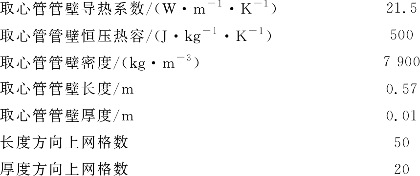 取心管管壁导热系数/(W·m-1·K-1)21.5取心管管壁恒压热容/(J·kg-1·K-1)500取心管管壁密度/(kg·m-3)7 900取心管管壁长度/m0.57取心管管壁厚度/m0.01长度方向上网格数50厚度方向上网格数20