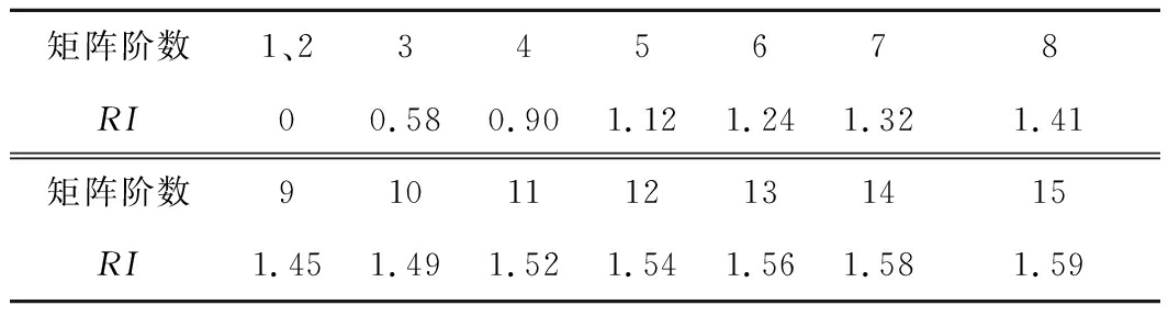其中:RI为同阶平均随机一致性指标,其值详见表2。