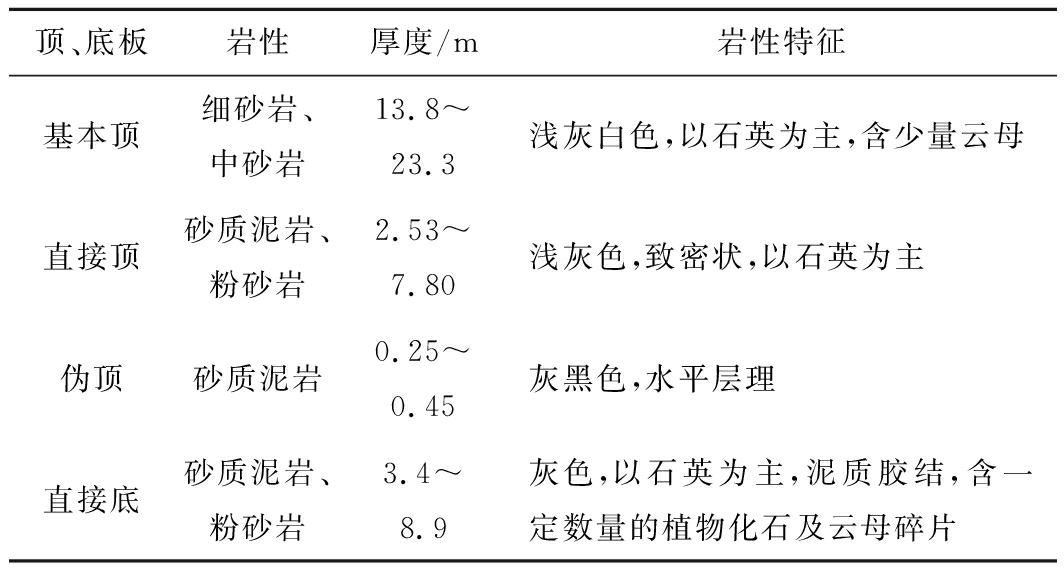 顶、底板岩性厚度/m岩性特征基本顶细砂岩、中砂岩13.8~23.3浅灰白色,以石英为主,含少量云母直接顶砂质泥岩、粉砂岩2.53~7.80浅灰色,致密状,以石英为主伪顶砂质泥岩0.25~0.45灰黑色,水平层理直接底砂质泥岩、粉砂岩3.4~8.9灰色,以石英为主,泥质胶结,含一定数量的植物化石及云母碎片