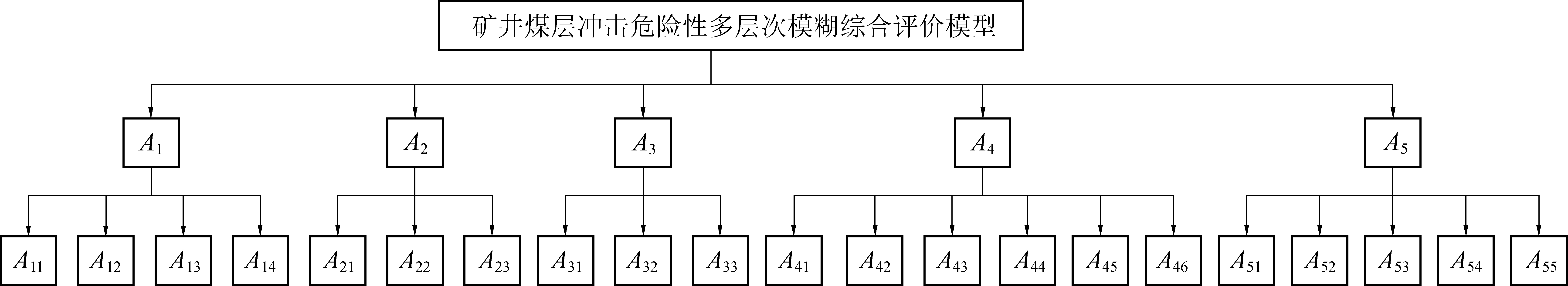 式中:A1为开采深度;A2为冲击倾向性;A3为煤层顶底板性质;A4为地质构造;A5为开采技术;A11为h≤400 m;A12为400 m<h≤600 m;A13为600 m<h≤800 m;A14为h>800 m;A21为煤的单轴抗压强度;A22为煤的弹性能指数;A23为煤的冲击倾向性鉴定结论;A31为上覆硬岩厚度;A32为上覆硬岩强度;A33为上覆硬岩至煤层距离;A41为断层的影响;A42为褶曲构造的影响;A43为煤层相变;A44为陷落柱的影响;A45为河流冲刷带的影响;A46为构造异常带的影响;A51为保护层卸压开采参数;A52为工作面邻空参数;A53为工作面开采参数;A54为工作面推进参数;A55为工作面采煤工艺。