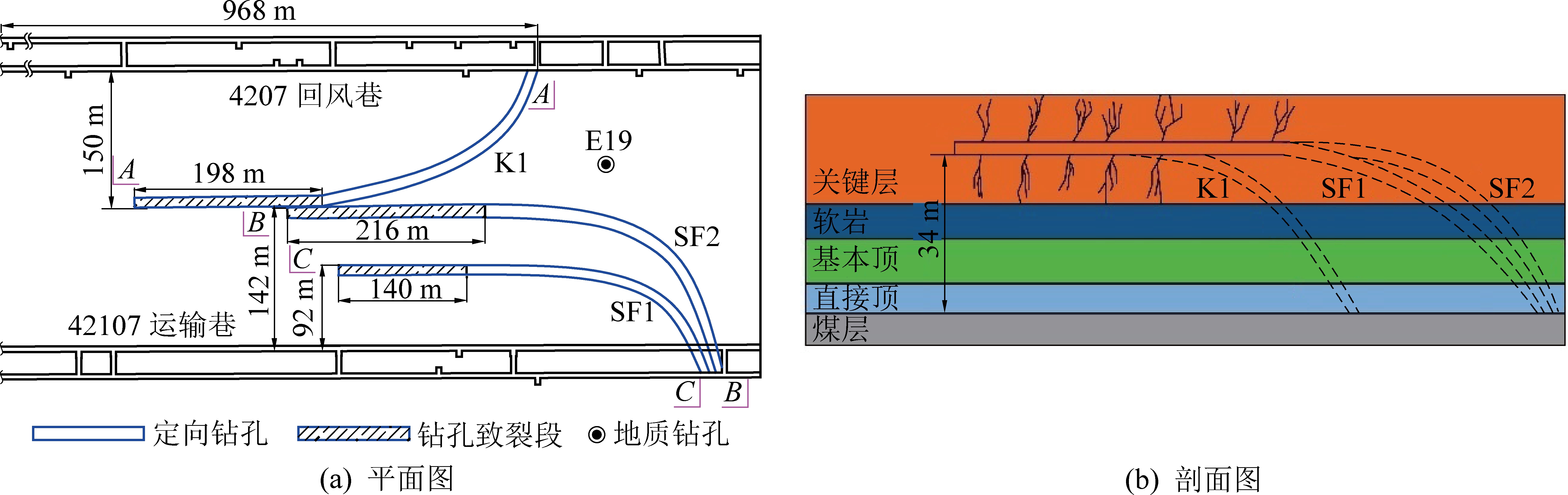 综合上述理论分析与数值模拟结果,确定在布尔台煤矿42107工作面开展定向钻孔水压致裂顶板岩层试验,预致裂的岩层选取亚关键层2。