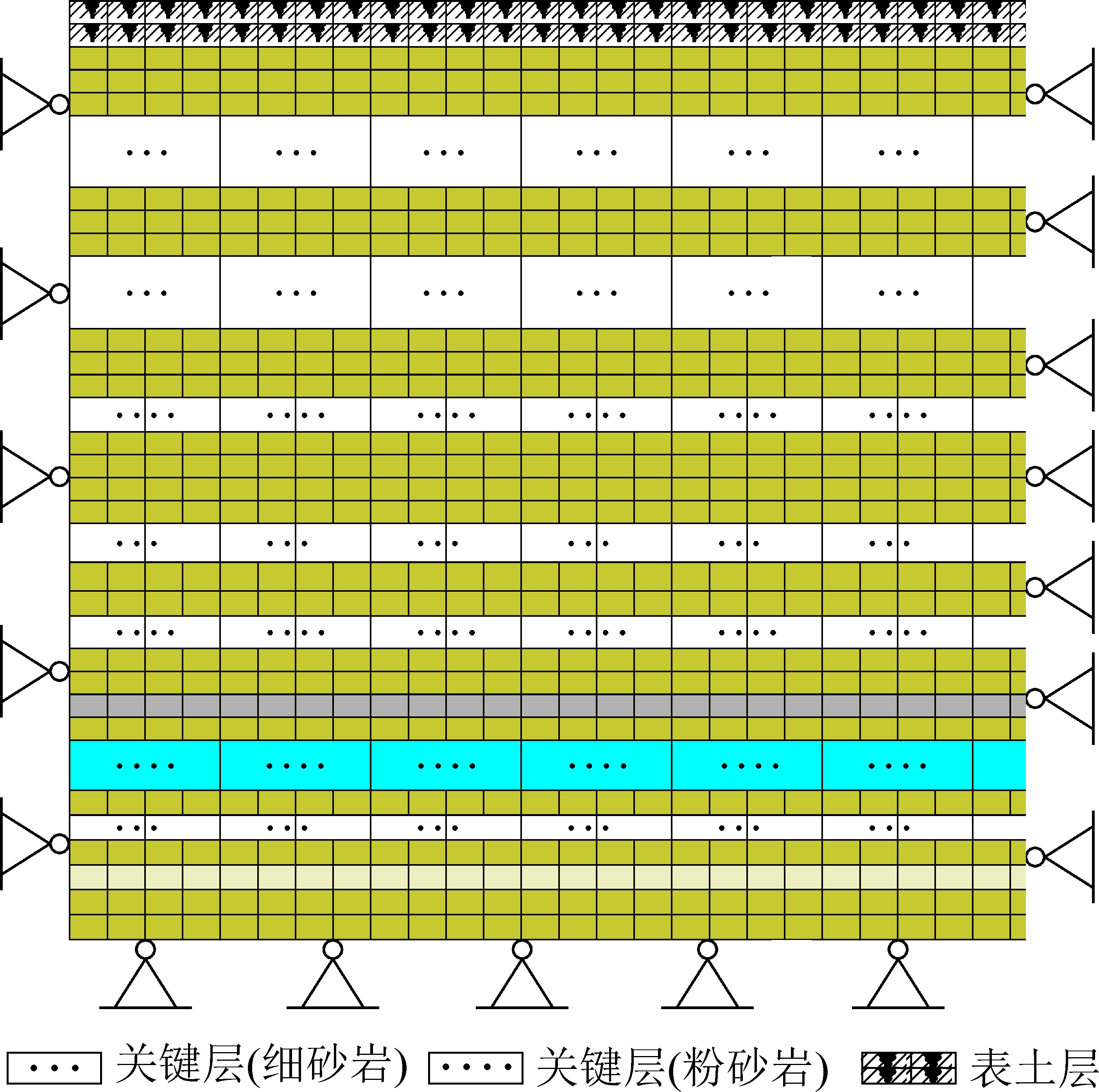 采用离散元数值模拟软件UDEC对顶板弱化改性降低采场强矿压的可行性开展研究。通过改变关键层破断块体竖向节理的摩擦角来模拟岩层物理力学性质的弱化,再对比分析关键层强度弱化与否时两侧煤柱的支承压力分布特征,并以此作为评价顶板致裂方案可行性的依据。模型长度为1 000 m,高度470 m,模型中各岩层赋存厚度参照图1,模型中不同岩性岩层的物理力学参数见表1。将模型上边界设定为自由边界并单边约束模型左右边界水平位移、双边约束模型底界面垂直位移,所有区域均定义为摩尔-库伦材料模型,模型示意如图4所示。