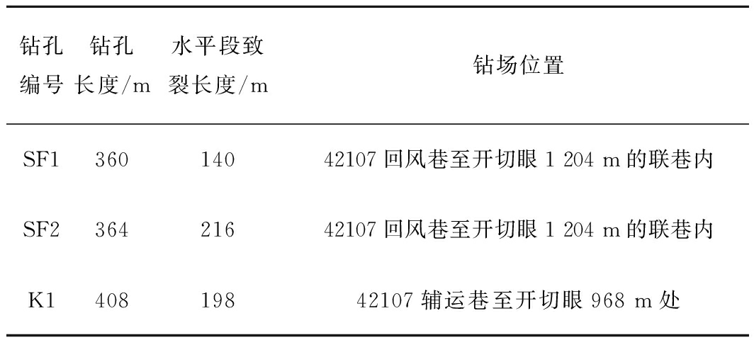 钻孔编号钻孔长度/m水平段致裂长度/m钻场位置SF136014042107回风巷至开切眼1 204 m的联巷内SF236421642107回风巷至开切眼1 204 m的联巷内K140819842107辅运巷至开切眼968 m处
