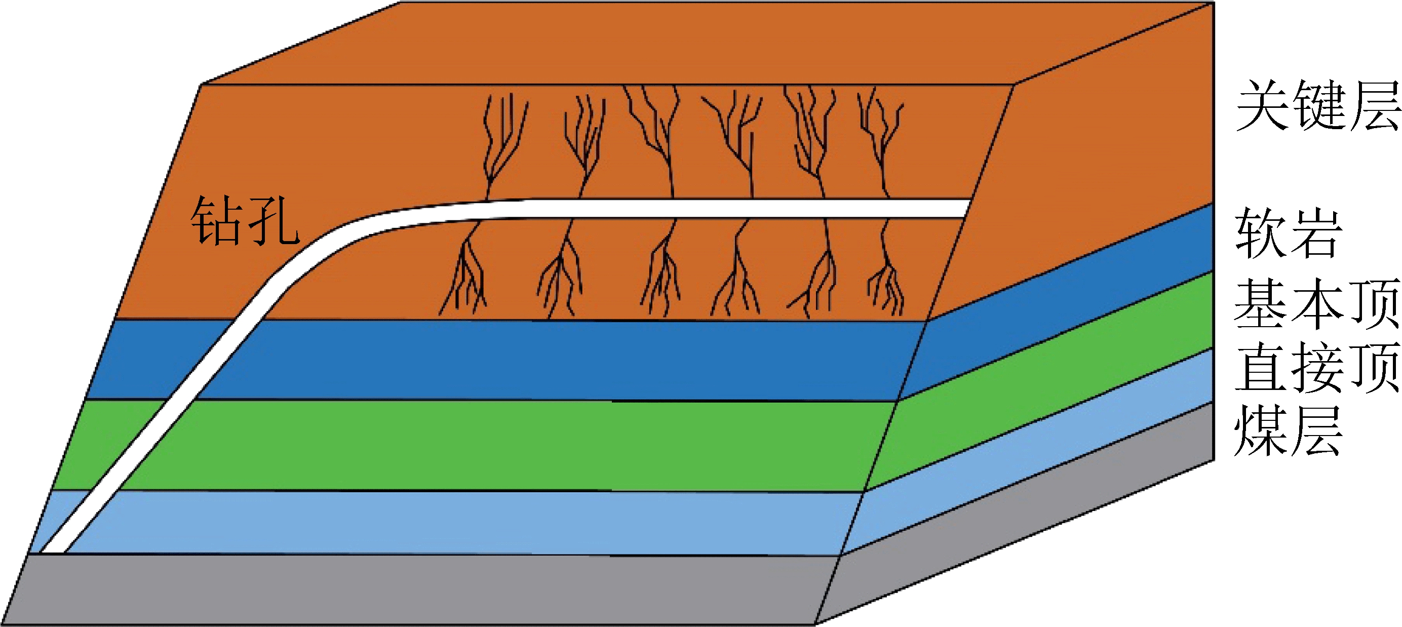 覆岩中的厚硬岩层通常控制着局部范围内岩层的破断运移,当基本顶或距煤层较近的岩层为关键层时,其破断块体大小和破断形式决定着矿压显现的剧烈程度。多学者研究了不同开采条件下关键层的破断特征、运动形式及其破断致灾机理,包括大采高开采[1],浅埋煤层开采[2-3],急倾斜煤层开采[4]等。姜海军等[5]研究发现关键层的破断主要为拉破坏,给出了关键层“O-X”破断过程中破断带的裂缝发育顺序,并指出由“O”型破坏沿煤壁切落的垮落类型对工作面矿压显现影响更为剧烈。鞠金峰等[6-7]提出覆岩关键层的“悬臂梁”垮落式运动易导致工作面周期来压步距增大,并且关键层悬臂梁结构越容易切落引发工作面发生端面漏冒。缪协兴等[8]通过现场实测和模拟试验发现超长工作面回采过程中关键层的破断对工作面矿压显现影响剧烈,尤其是主关键层的破断。陈荣华等[9]提出工作面矿压显现与覆岩中相邻关键层的破断顺序有关。上述研究表明,关键层在覆岩运动中特定的承载能力和控制作用,使得其破断顺序和破断形式是决定工作面矿压显现的关键因素。