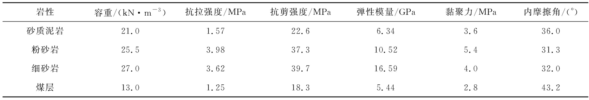 岩性容重/(kN·m-3)抗拉强度/MPa抗剪强度/MPa弹性模量/GPa黏聚力/MPa内摩擦角/(°)砂质泥岩21.0 1.5722.66.343.636.0粉砂岩25.5 3.9837.310.525.431.3细砂岩27.0 3.6239.716.594.032.0煤层13.0 1.2518.35.442.843.2