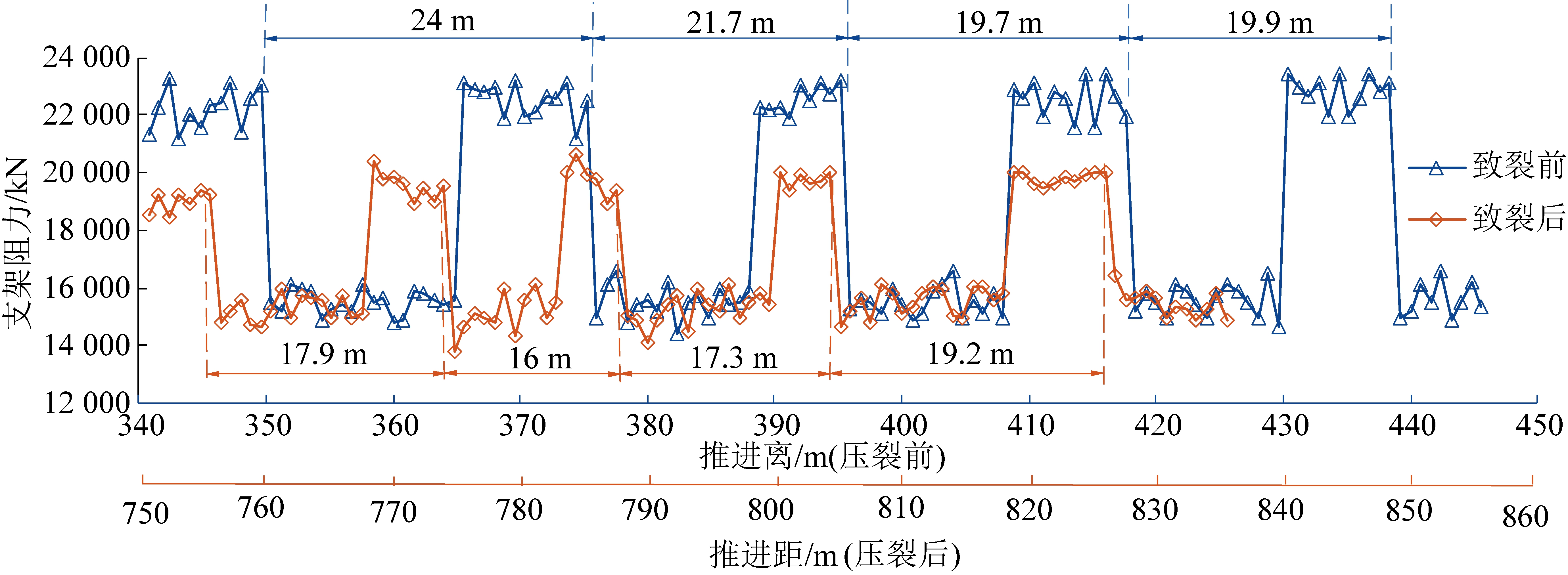 由图7可知,在亚关键层2致裂前,42107工作面的周期来压步距长度平均为21.0 m,周期来压持续长度约7.5 m,经统计支架平均末阻力为22 535 kN;当采用定向钻孔水压致裂亚关键层2之后,42107工作面的周期来压步距减小至16.9 m,周期来压持续长度降至4.9 m,支架平均末阻力为19 599 kN,已经小于工作面支架额定阻力(21 000 kN)。这一结果表明,在采用定向钻孔水压致裂亚关键层2之后,工作面回采时的周期来压步距、来压持续长度以及支架末阻力都显著降低。以上工业试验结果表明:顶板定向钻孔水力压裂可以较好地控制工作面强矿压。