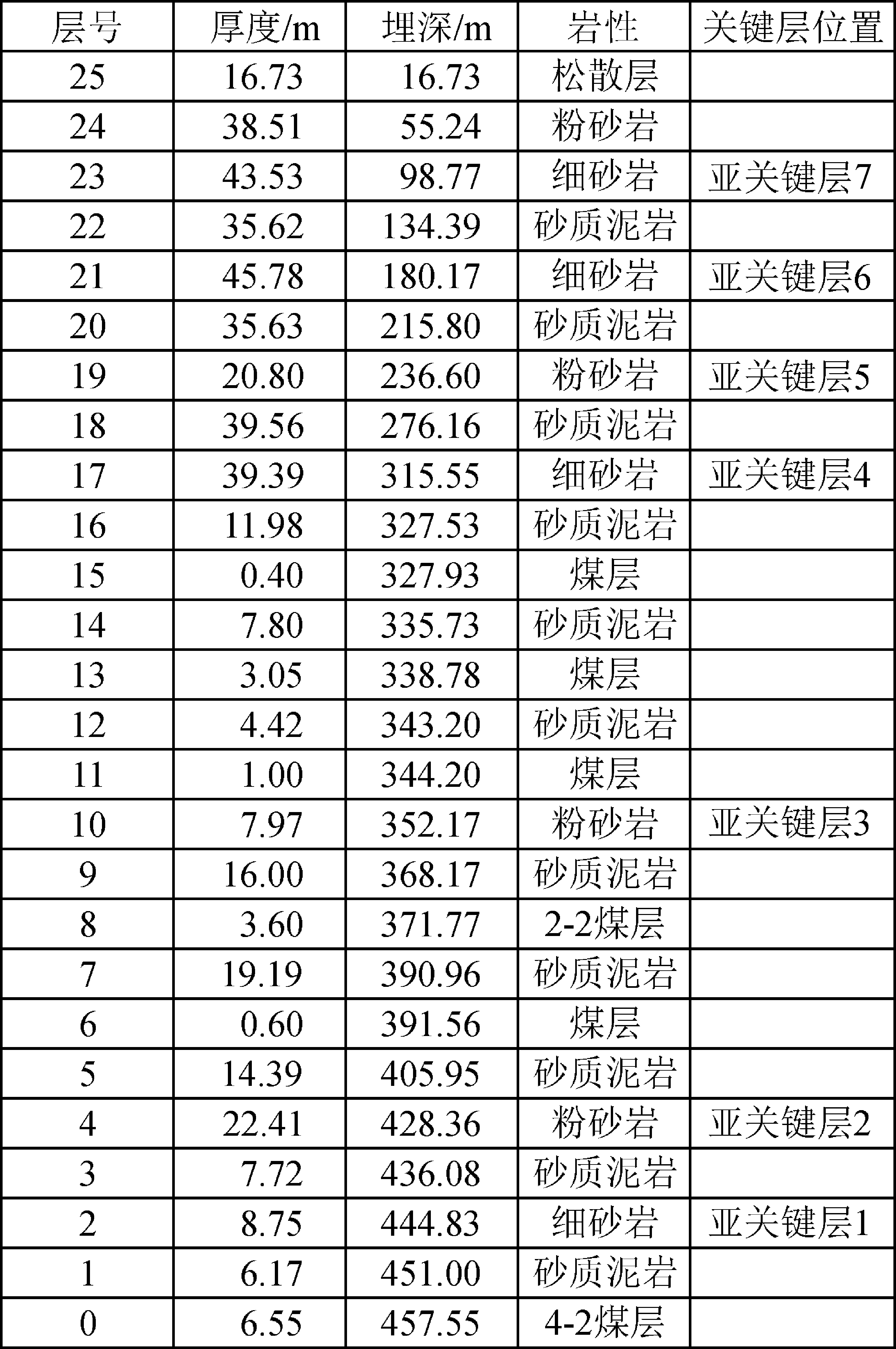 布尔台煤矿42107工作面主采4-2煤层,平均煤厚6.5 m,煤层倾角1°~3°,工作面宽为300.30 m,埋深457.65 m,与4-2煤层间距70 m的上覆2-2煤层已回采完毕。42107工作面采用ZFY21000/25/39D双柱掩护式放顶煤液压支架,采煤高度为3.5 m,放煤高度为3.0 m,采放比1∶0.86,日推进速度平均为10 m/d。根据42107工作面内的钻孔柱状,应用关键层判别软件KSPB分析覆岩关键层赋存位置[23],如图1所示。结果表明,4-2煤与2-2煤层之间存有2层关键层,分别为8.75 m的细砂岩亚关键层1和厚22.41 m的粉砂岩亚关键层2。