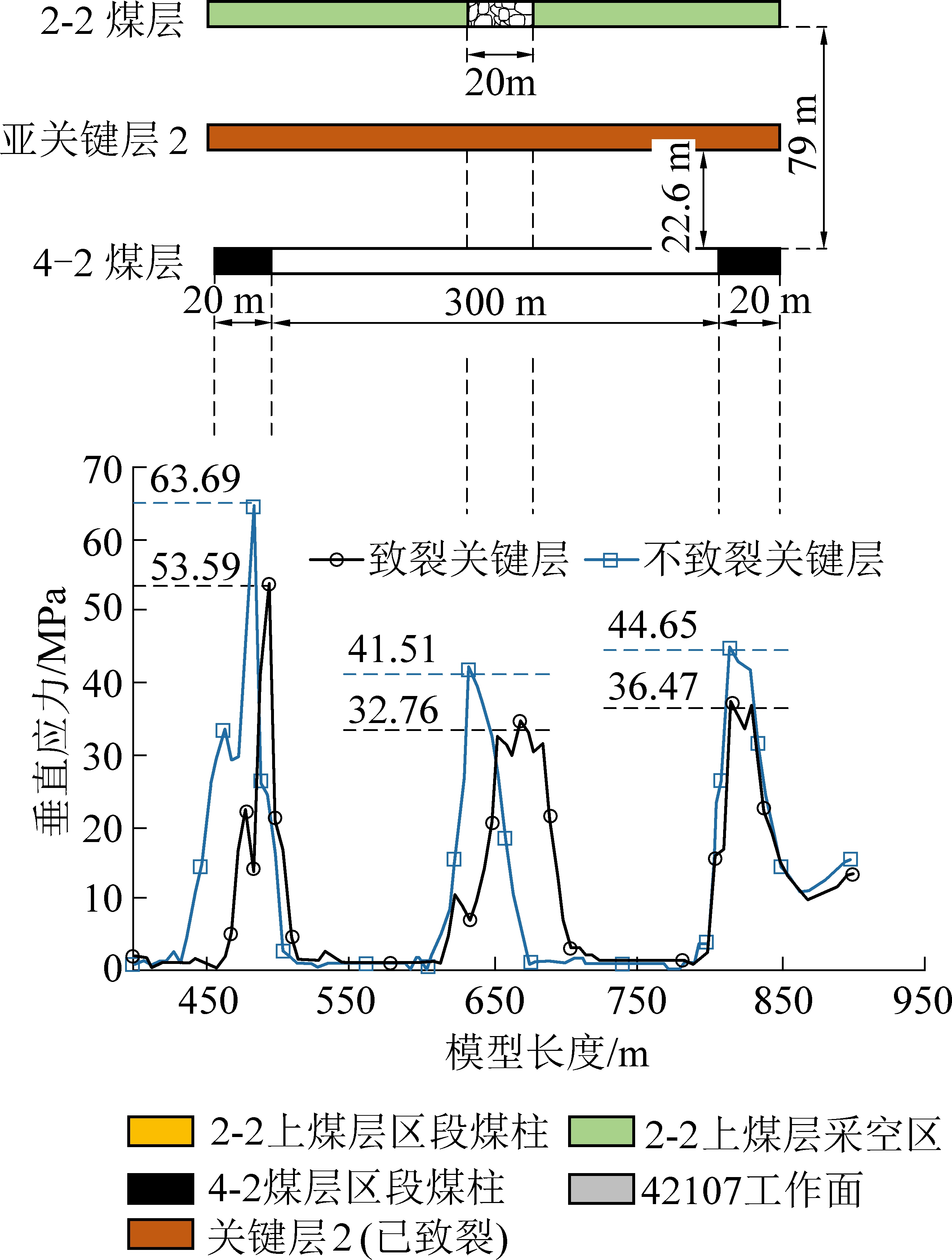 通过减小亚关键层2破断块体竖向节理的摩擦角以对亚关键层2进行强度弱化改性,类似于对顶板进行致裂。亚关键层2致裂与否对42107工作面两侧区段煤柱和实体煤壁支承压力的影响如图5所示。