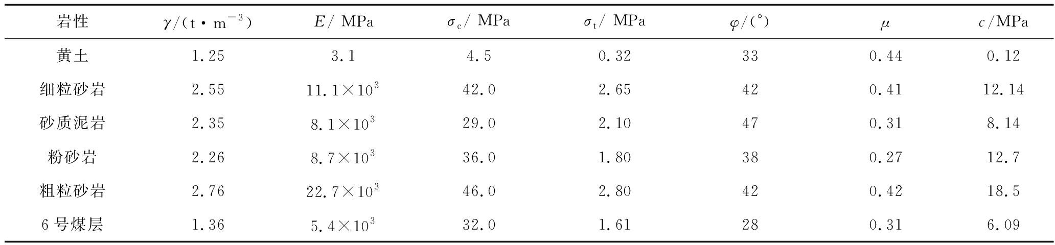 岩性γ/(t·m-3)E/ MPaσc/ MPaσt/ MPaφ/(°)μc/MPa黄土1.253.14.50.32330.440.12细粒砂岩2.5511.1×10342.02.65420.4112.14砂质泥岩2.358.1×10329.02.10470.318.14粉砂岩2.268.7×10336.01.80380.2712.7粗粒砂岩2.7622.7×10346.02.80420.4218.56号煤层1.365.4×10332.01.61280.316.09