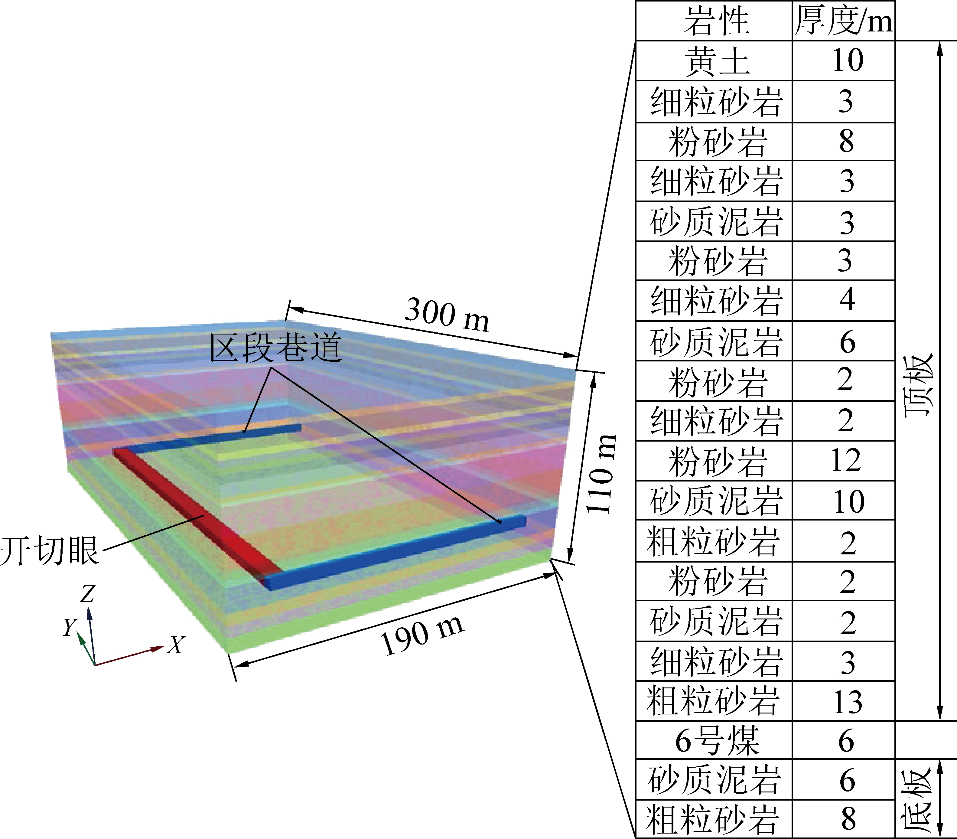 纳林庙煤矿位于鄂尔多斯市准格尔旗羊市塔乡,主采6号煤层,平均厚度6 m;埋深76~104 m,平均88 m;地表覆盖层主要是黄土,平均厚度10 m,基岩层平均厚度78 m,属于典型的浅埋煤层开采。严格按照顶底板柱状图建立数值模型,如图1所示。模型长×宽×高为190 m×300 m×110 m,模型前后左右及底部固定位移。模型内布置有区段巷道和开切眼,首先进行区段巷道与开切眼的开挖模拟,然后进行工作面回采模拟。模拟工作面倾向长度为240 m。