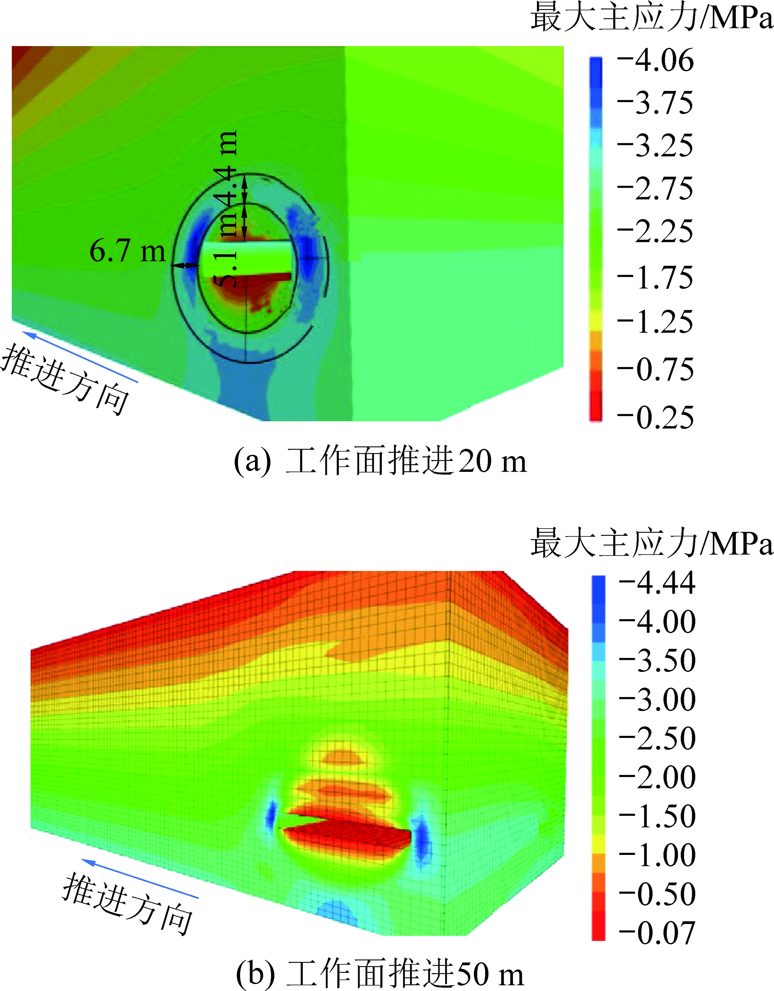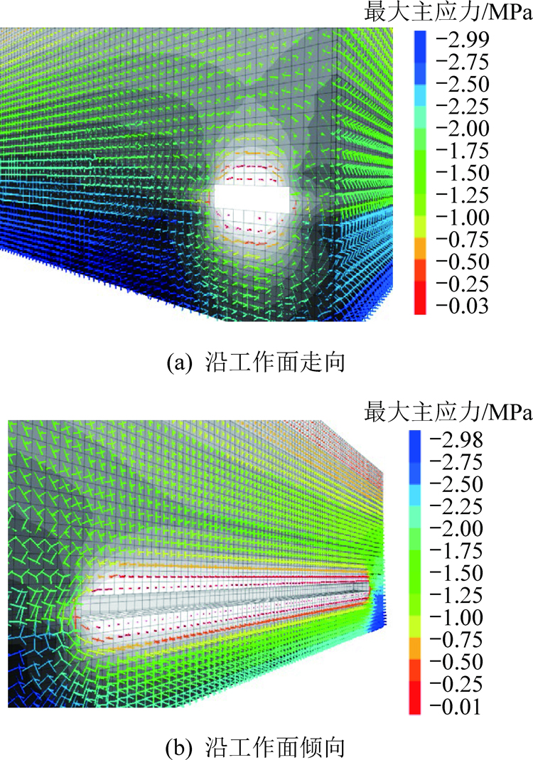 浅埋煤层开采后造成上覆岩层破坏和围岩应力的重新分布。图2为工作面推进距离为20 m时,围岩最大主应力矢量线沿工作面走向和倾向的分布情况。可以看出,工作面围岩中最大主应力在回采空间周边区域形成了类椭球体应力集中带,在沿工作面走向与倾向方向上,均呈现为拱状应力承载结构——承压拱。