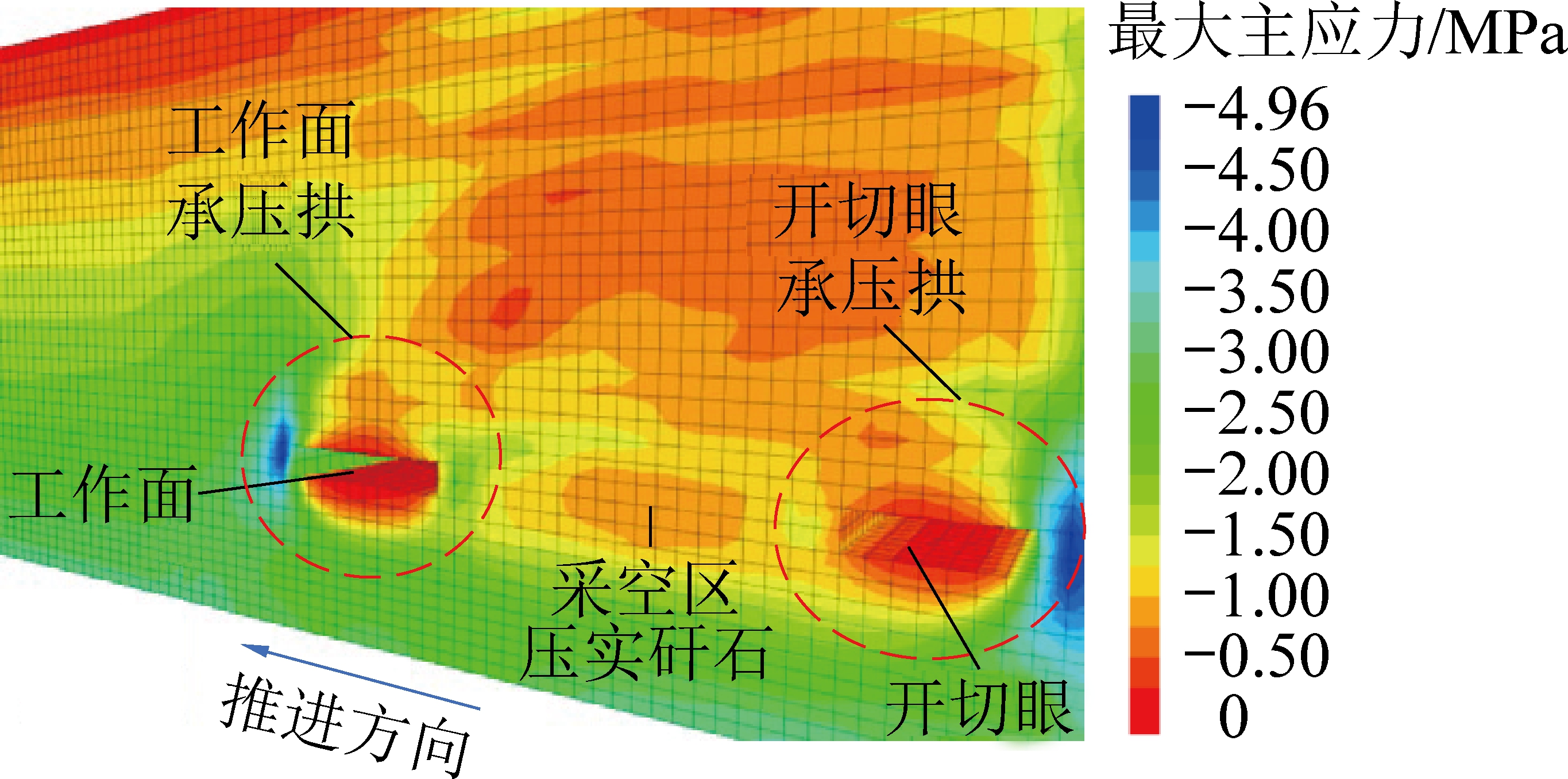 随着工作面的推进,顶板岩层逐渐下沉破坏,以工作面前后方煤体为支承的承压拱结构不断发展变化,承压拱的高度、跨距均逐渐增大。同时,承压拱内的应力仍然明显高于其内、外部岩体的应力,依旧是稳定的承载结构。