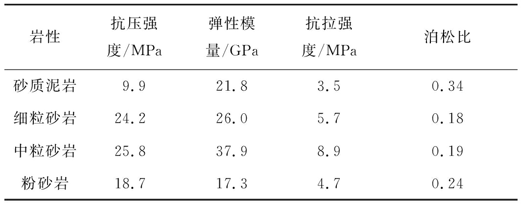 岩性抗压强度/MPa弹性模量/GPa抗拉强度/MPa泊松比砂质泥岩9.921.83.50.34细粒砂岩24.226.05.70.18中粒砂岩25.837.98.90.19粉砂岩18.717.34.70.24