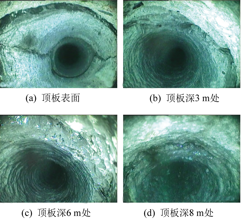 在巷道掘进期间,采用高清工业内窥镜对顶板裂隙发育情况进行了探测分析,探测结果表明钻孔深入岩层0~8 m均有明显裂隙存在,裂隙极为发育(图3)。根据探测分析结果并结合取心统计,巷道顶板虽然以中细粒砂岩、粗砂岩为主,岩体强度较高,但岩体内高角度(70°~80°)裂隙发育,岩体完整性差。在多重采动影响下,巷道顶板变形破坏将较为严重,导致锚杆锚索支护结构尤其是内锚可靠性严重降低,支护设计时应考虑顶板围岩结构重构,同时解决支护结构内锚可靠性问题。