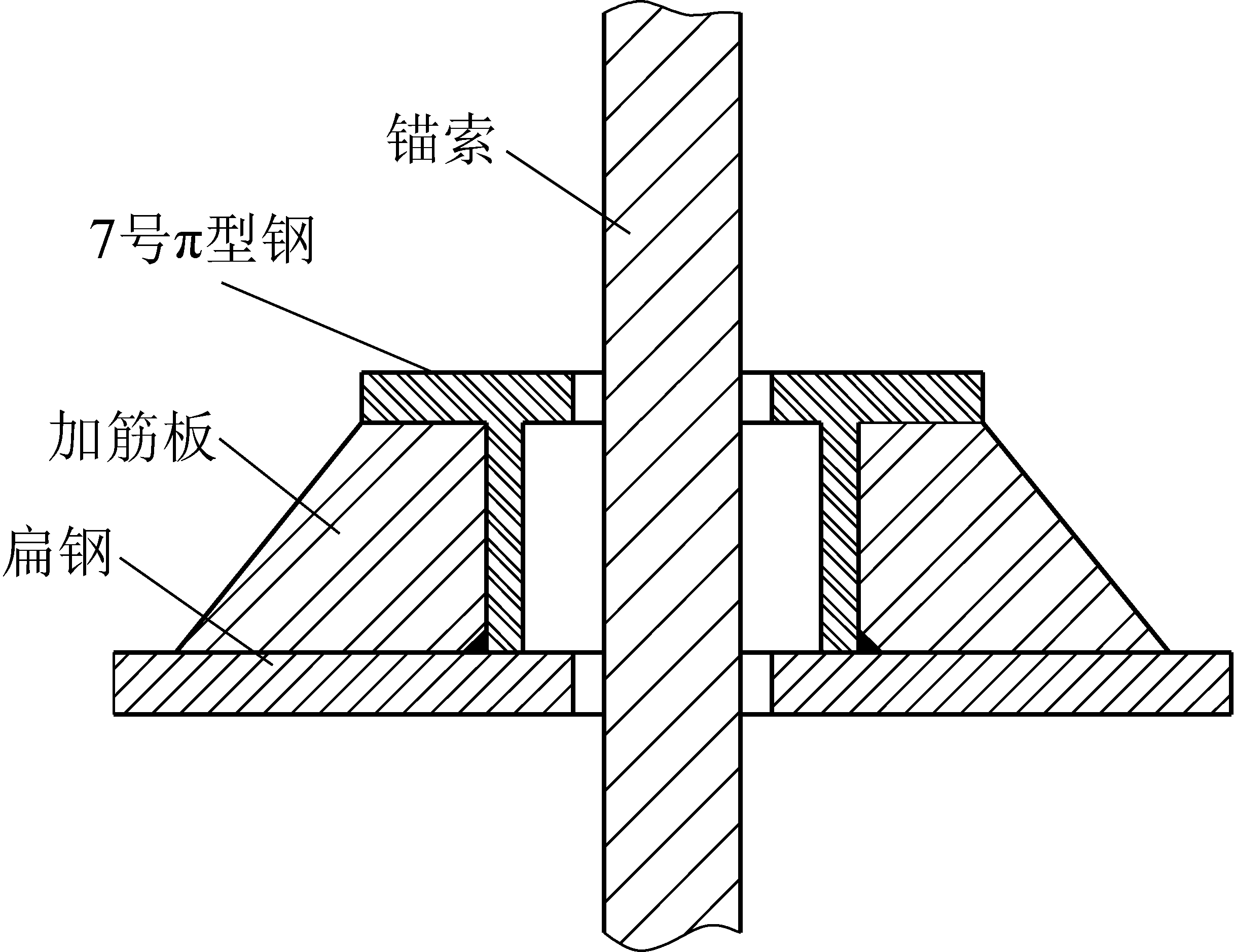 目前常用的槽钢梁、T3钢带等锚索组合构件强度与刚度偏低。对于深部复杂应力巷道,组合构件通常在远未达到锚索额定支护力的情况下就会发生屈服或破坏,锚索组合支护作用大幅降低,同时导致围岩压力向组合构件破坏后的无支护空间卸载,进一步降低锚索支护效率,最终导致支护失效。针对上述问题,研制了锚索高强组合箱型梁(图6),采用矿用7号π型钢与钢板焊接而成。经理论计算[21],其承载能力较T3钢带提高14倍以上,较14号槽钢提高8倍以上,支护强度及刚度得到显著提升。