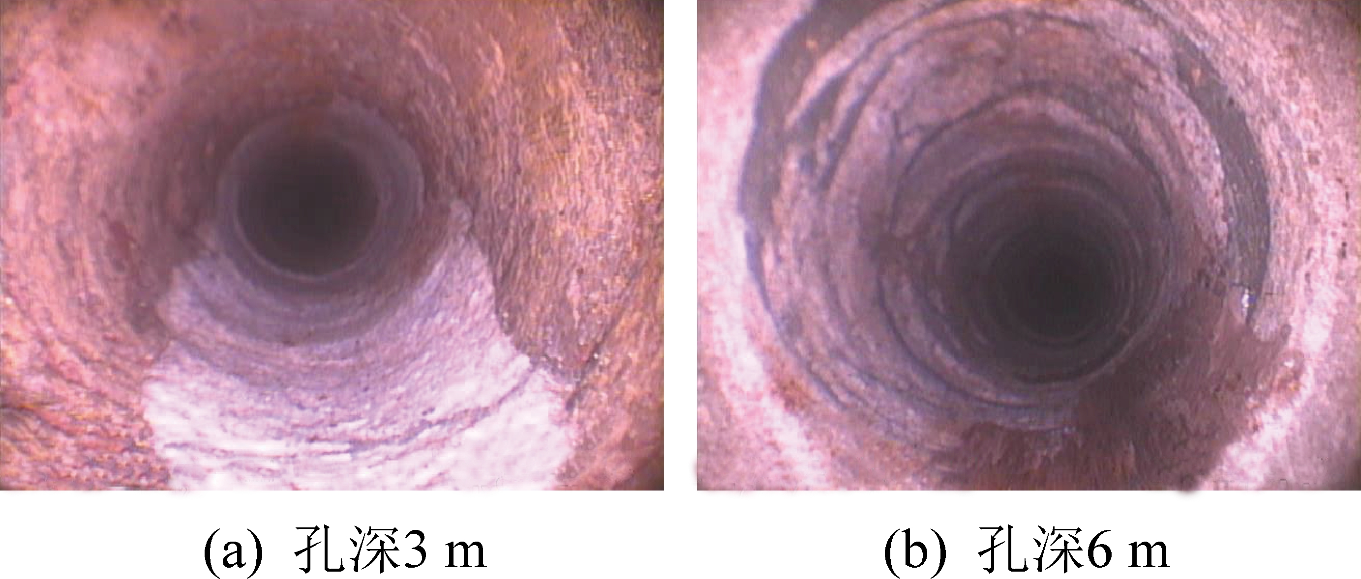 滞后工作面240 m以后,对前期施工的孔壁注浆锚索(配合中空注浆锚索)进行了注浆施工,①将已经发生破碎的顶板进行注浆重构,恢复其自稳能力;②将已失效的锚杆锚索的内锚结构重新恢复其锚固性能;③在树脂锚固段外端至孔口的自由段,采用水泥浆锚固,形成全长锚固锚索。巷道经局部刷扩、修护及注浆围岩重构后,断面满足了17111(3)工作面的瓦斯抽采使用要求,钻孔窥视如图9所示。