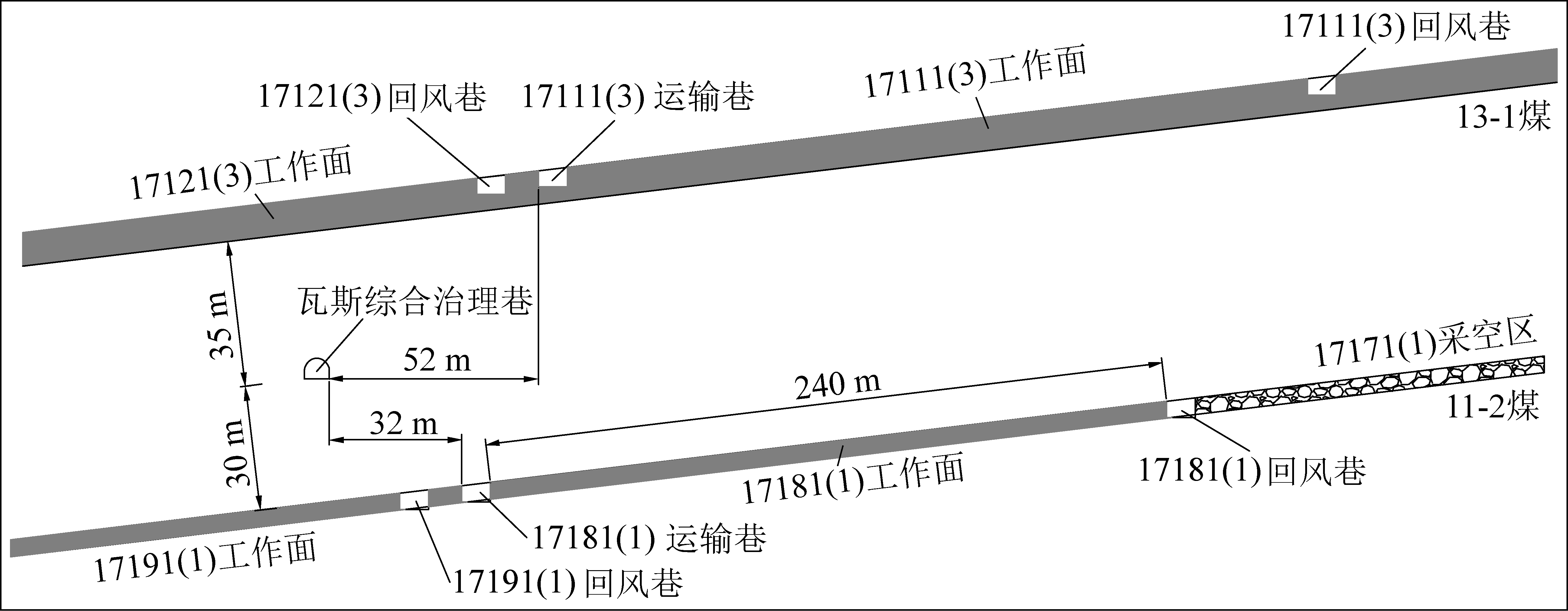 潘三矿为高瓦斯突出矿井,主采的11-2、13-1煤均为突出煤层,11-2煤层埋深740~800 m,两煤层间距约72 m。为实现11-2煤17181(1)工作面和13-1煤17111(3)工作面的瓦斯联合治理,并充分考虑后期待采的17191(1)工作面的瓦斯抽采,研究并实施“一面三巷、一巷多用、联合治理、连续开采”的瓦斯治理模式,利用1条瓦斯综合治理巷道实现3个工作面的瓦斯抽采和消突。