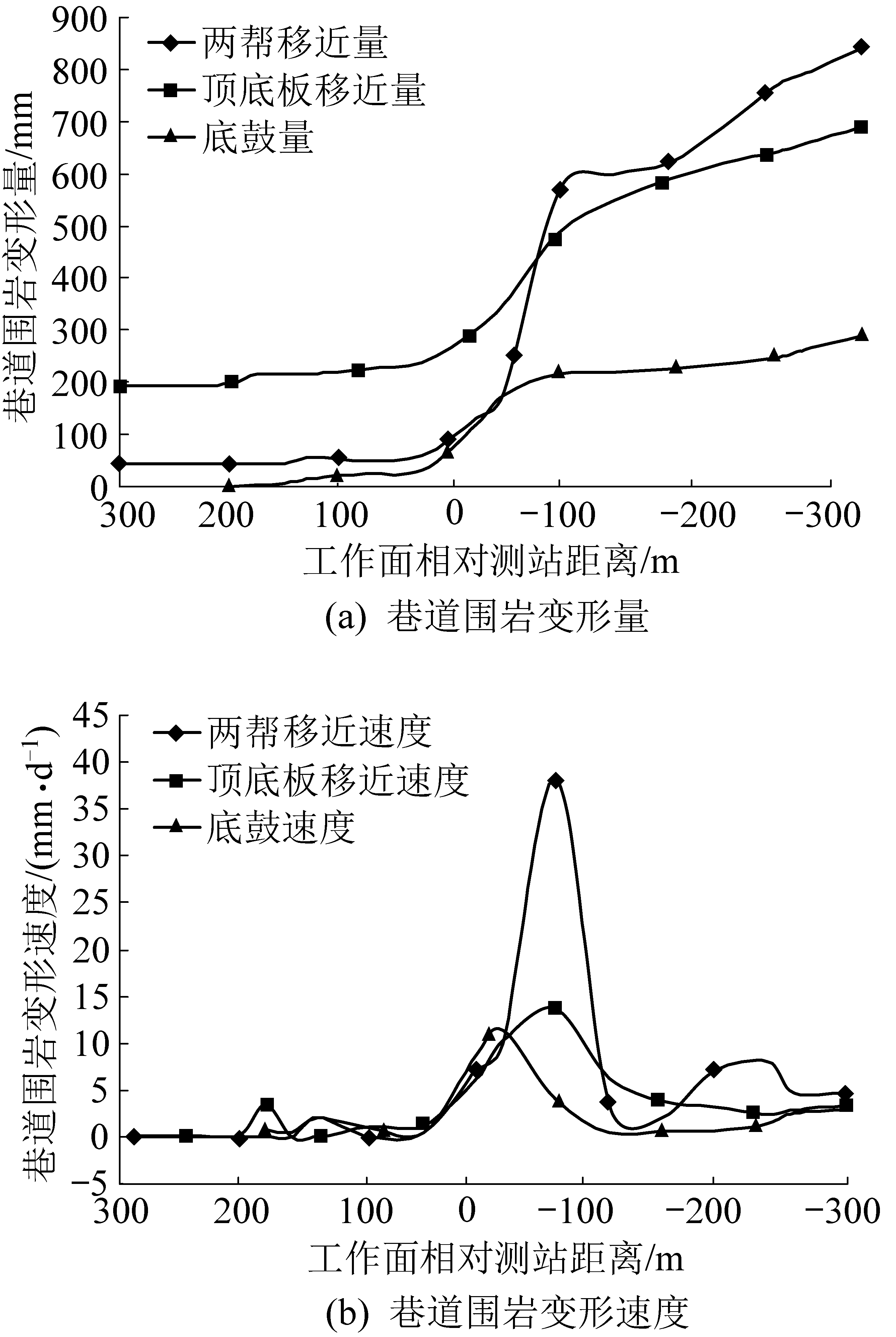 2)17181(1)在工作面回采期间,两帮变形量840 mm左右,顶底板移近量690 mm左右,顶板局部破坏较为严重,采动影响极为剧烈。超前工作面20 m至滞后工作面30 m内瓦斯综合治理巷道开始受到采动影响,此后巷道围岩变形速度急剧增大,滞后工作面200~240 mm后巷道围岩变形趋于相对稳定,围岩变形速度小于3 mm/d,围岩变形如图8所示。