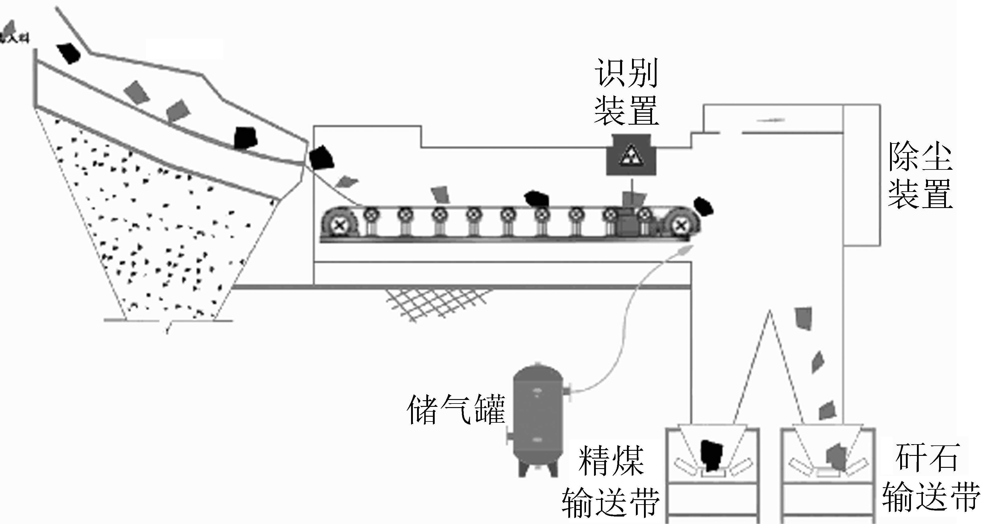 可用于井下的TDS光电分选机具有体积小和模块化的特点,适合煤矿井下狭小空间的应用,可安装在集中带式运输巷,也可安装在采区带式运输巷。工作过程如图22所示,原煤经带式输送机运送到分选装置的滚轴筛,筛下物由主运带式输送机运送,筛上物进入分选机,利用X射线与图像识别进行分选,再通过高压风将煤矸分开。由于分选的是筛上物,同时分选机是模块化结构,可适应不同井型的需求。