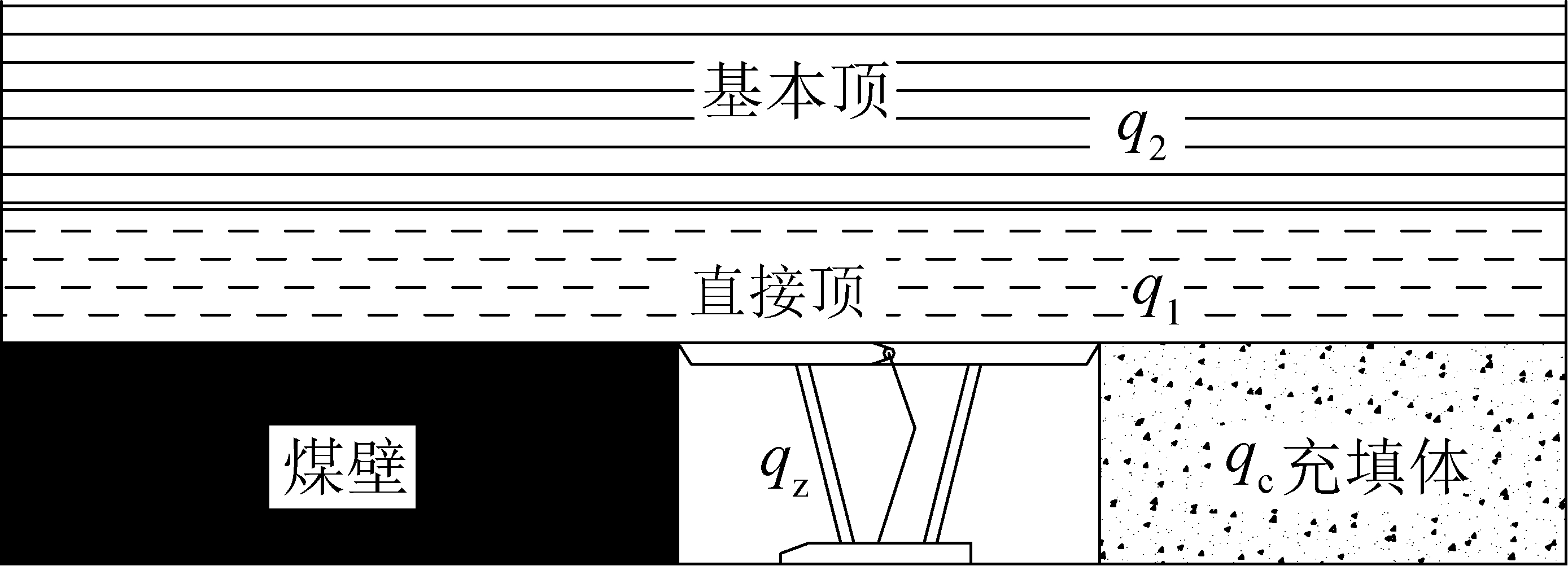 充填开采是在采煤过程中将矸石或其他废弃物充填到采空区,煤体、支架和充填材料接力支护顶板,有效地支撑着上浮岩层,支撑上覆岩层,直接顶和基本顶不垮落,没有初次来压和周期来压,如图3所示,图中q1、q2分别为基本顶及直接顶载荷;qz、qc分别为支架工作阻力和充填体强度。