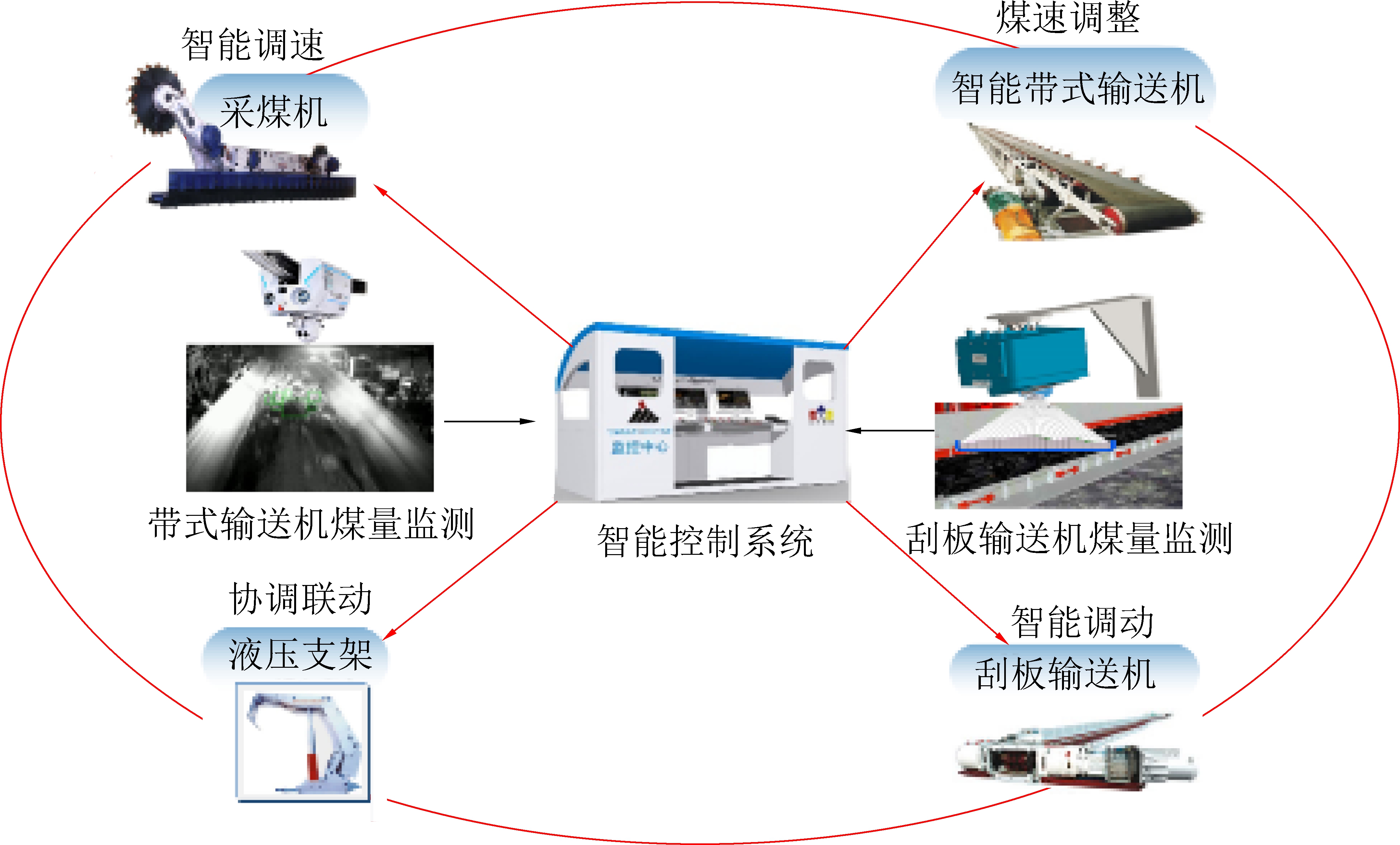 为此研发了基于煤流量智能感知的智能化协同控制系统(图4),基于工作面煤量智能监测装置,智能感知前(后)刮板输送机、带式输送机煤流量,结合刮板输送机功率、转矩实时监测信息,自动调整采煤机割煤速度,通过变频调速智能控制刮板输送机运行速度,自动调整液压支架跟机移架方式与移架速度,形成基于主输送带、前(后)部刮板输送机煤流监测的智能决策机制,实现液压支架、采煤机和前后部刮板输送机等综采设备的协调联动、智能运行。上述系统开始在大同塔山矿进行试验。