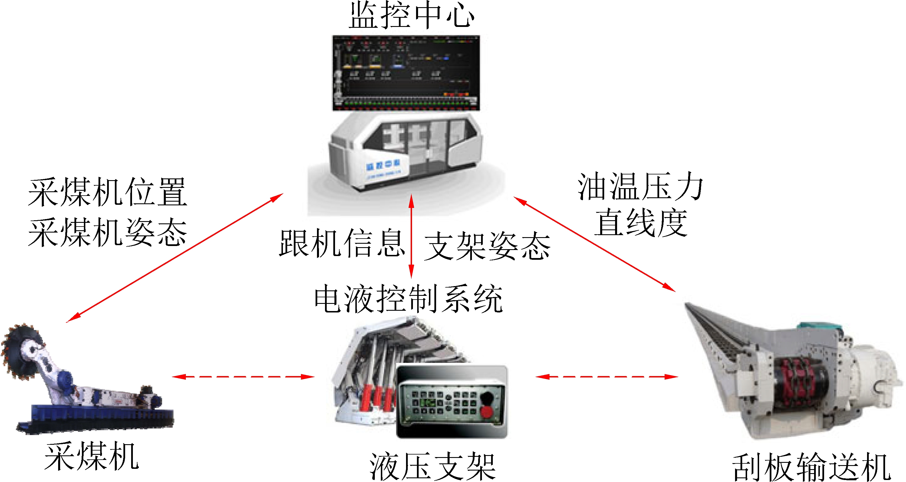 智能化开采的特点是工作面系统和装备具有智能感知、智能决策和智能控制3个智能化要素[5-6]。与之相对应,为了解决相关智能化要素,我国智能化开采初级阶段的发展也经历了3个发展时期。2014年黄陵矿实现了基于采煤机记忆截割、综采装备可视化远程干预的初步智能化开采[7-8],主要解决基于视频信息的智能感知问题。2016年兖矿集团转龙湾煤矿采用LASC惯性导航装置实现工作面设备自动找直,主要解决工作面设备智能控制问题[9]。2018年,笔者带领团队在陕西煤业化工集团张家峁煤矿和陕西延长石油集团巴拉素煤矿分别进行生产矿井智能化改造和新建矿井智能化煤矿顶层设计[10],通过建设矿井智能管控平台来解决智能决策缺失问题。目前智能化开采3要素中,智能感知发展相对充分,智能控制也有一定程度发展,而智能决策发展则相对滞后。考虑到基于神经网络的深度学习机理仍不清晰,现阶段切实可行的方法是基于工作面采、支、运设备智能感知信息,研究综采设备数据协同与共享交换机制,研发工作面智能化协同控制系统,研究割煤、运煤、移架协同联动机制,实现采煤机、液压支架、刮板输送机协同联动、自动运行,达到智能决策效果(图1)。