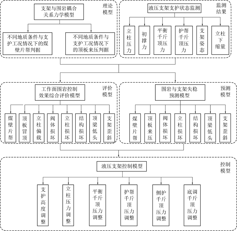 与薄及中厚煤层开采不同,超大采高开采极易诱发上覆岩层整体断裂并形成强动载矿压,煤壁片帮、冒顶难以控制,工作面采煤、支护和输送成套装备连续可靠运行难以实现。为了解决超大采高工作面因采高增加带来的强动载矿压与煤壁片帮冒顶等问题,笔者提出了基于支架与围岩耦合的超大采高液压支架自适应控制技术(图15),研发了超大采高工作面人-机-环智能耦合高效综采模式,实现了超大采高煤层安全高效开采[16-19]。